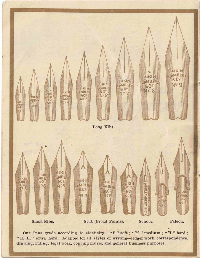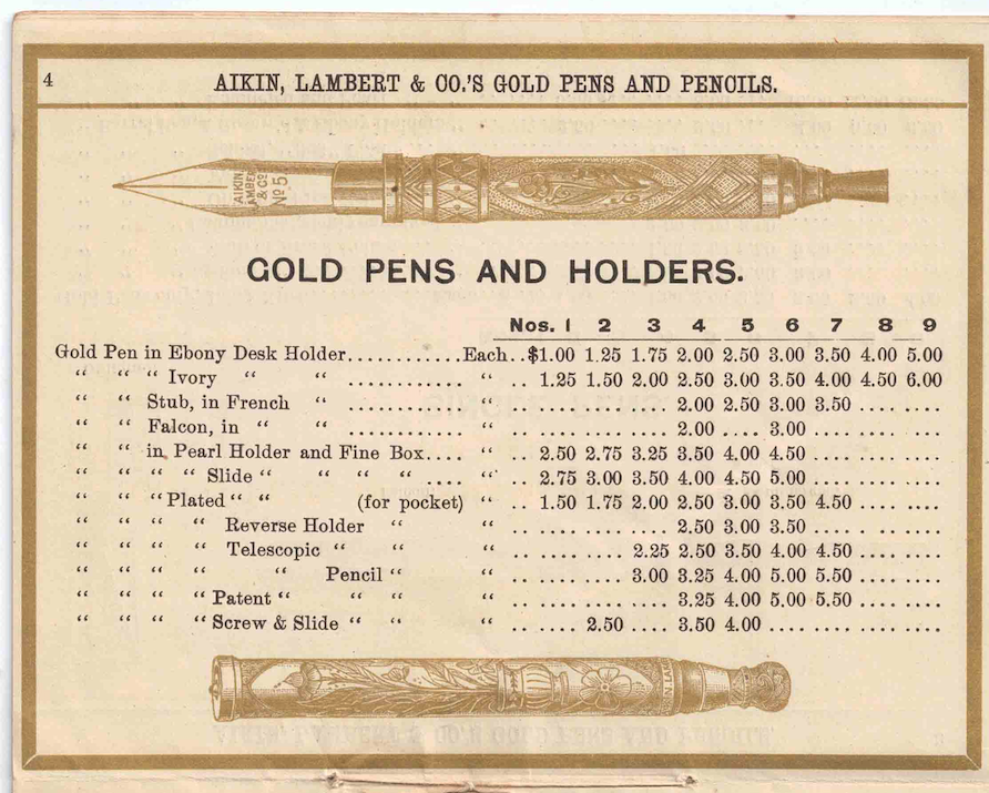 Il prezzo dei soli pennini Long Nibs variava dai 0,75 dollari per il nr. 1 ai 4,00 dollari per il nr. 9 (con incremento di 50 centesimi ad ogni salto di misura) ; gli Short Nibs da 2,00 a 3,00 dollari disponibili solo nelle misure dalla 5 alla 7.