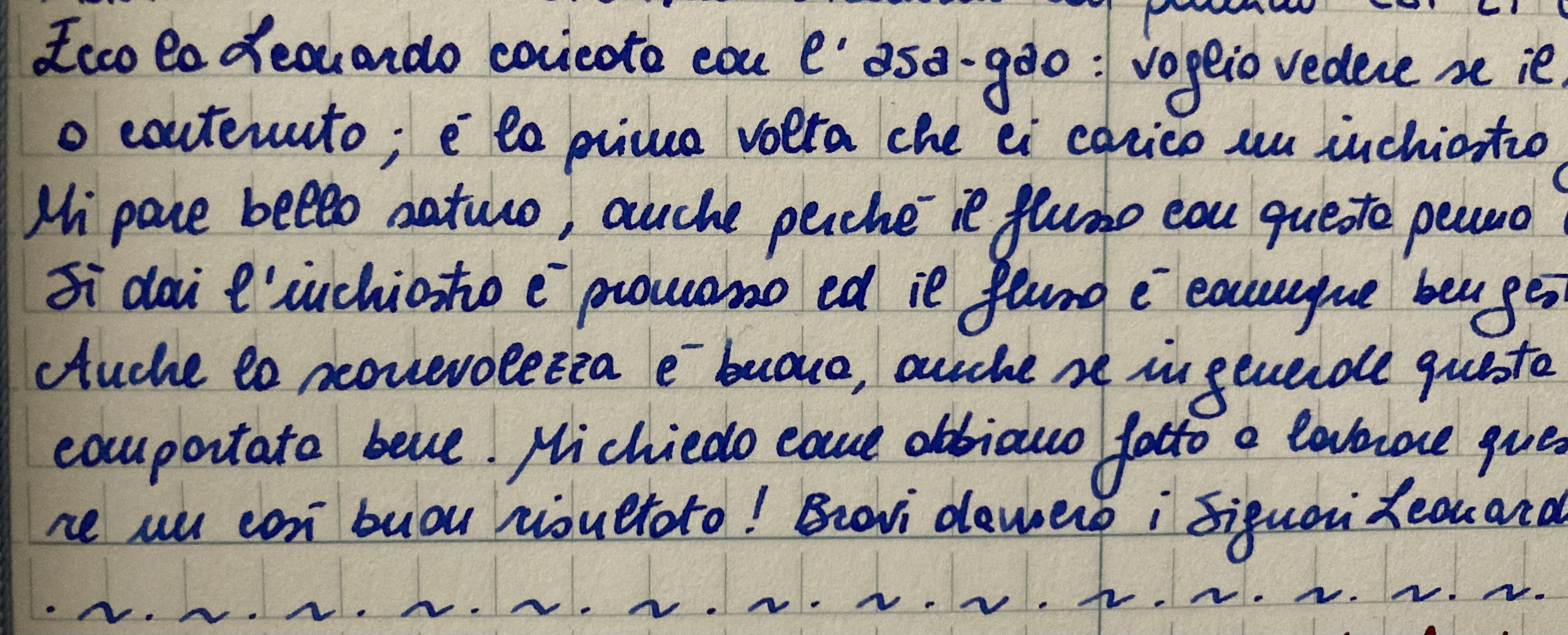 piccardi ha scritto: venerdì 9 febbraio 2024, 20:45 PS per Silvia, ho guardato il tuo esempio scritto, ma, francamente, io non riesco a vederci una variazione di tratto significativa, e se i quadretti sono i soliti da 5mm, non mi pare neanche che il tratto sia un granché EF.