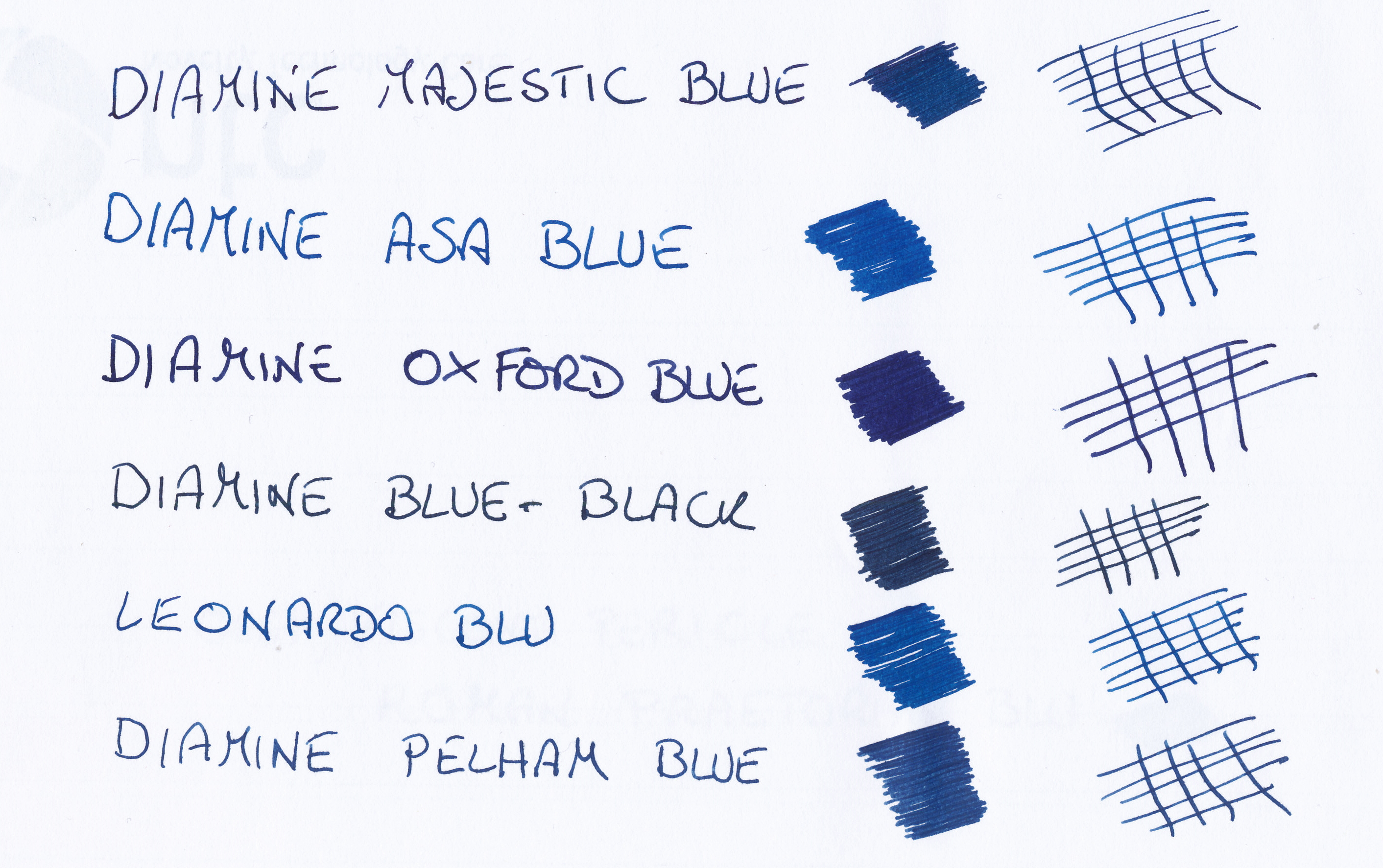 Mi inserisco nella discussione, anch'io ho una boccetta di Majestic blue, e non ha per nulla una componente verde, anzi è un blu piuttosto saturo con una tendenza al rosso, infatti sulle carte un po' patinate sfoggia uno sheen rosso rubino.