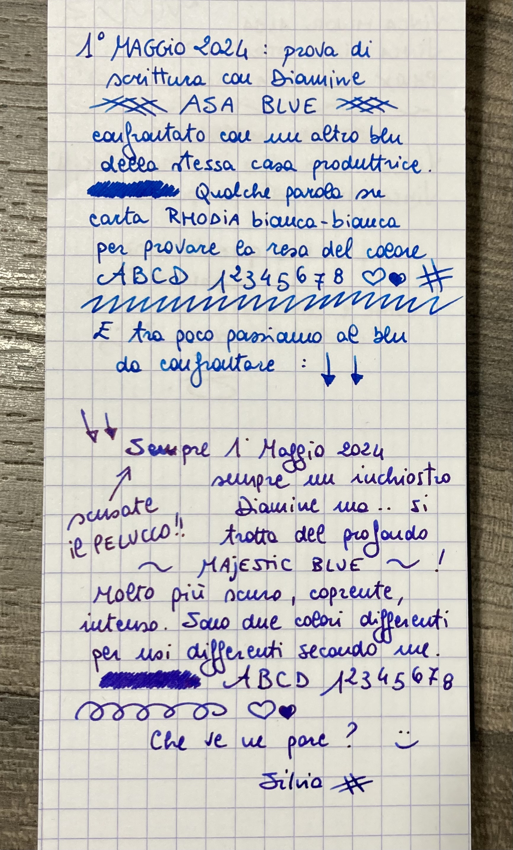 Quello di Senseri mi sembra tantissimo un altro blu che ho provato: il Diamine ASA Blue, è proprio uguale a quello lì: blu medio, componente verde, un blu "mare" con una discreta capacità di sfumature ma niente sheen, men che meno rosso.