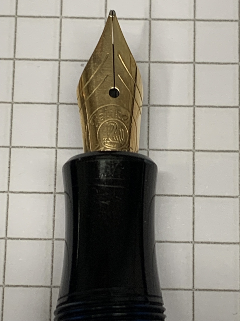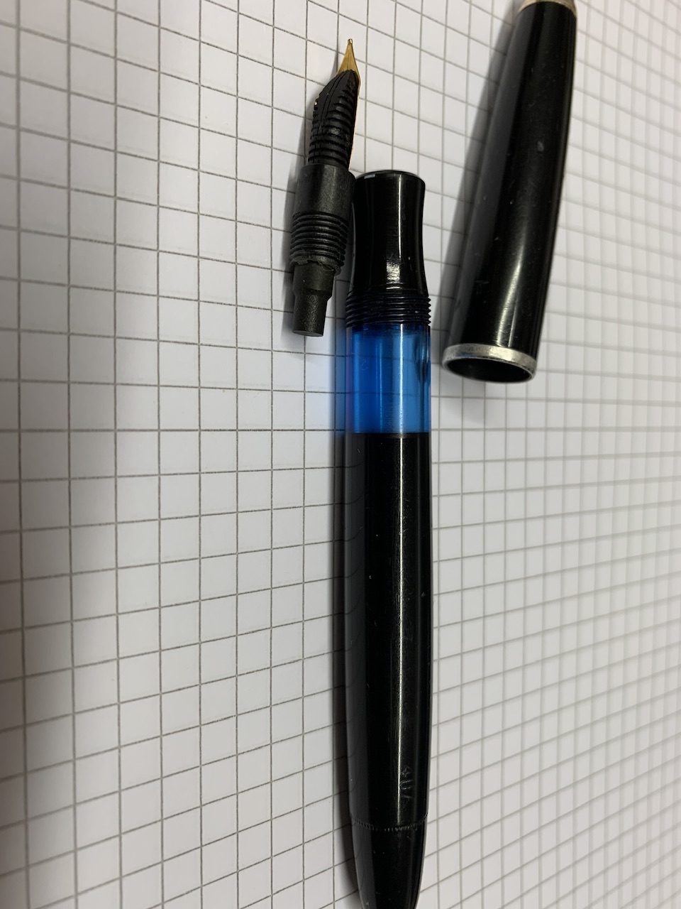 Era intasata e con pennino rotto in punta e corroso. Non essendo esperta, mi sono limitata a ripetuti lavaggi. Il pistone si è sbloccato e ora si riesce a caricare la penna, anche se il serbatoio e il pistone stesso sono ancora leggermente incrostati di inchiostro. La penna sembra funzionare: per provare ho messo il pennino di una Jinhao 82.