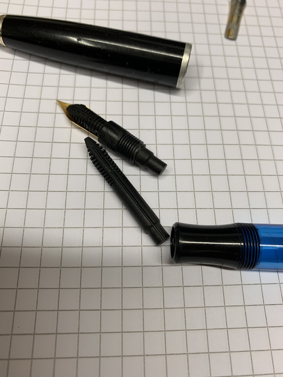 4. Come ho già scritto probabilmente ti è rimasto il collarino incastrato dentro la sezione, se riesci a rimettere il pennino di ricambio insieme con l'alimentatore direttamente ficcandoseli dentro e la penna non perde inchiostro, lascia tutto com'è.