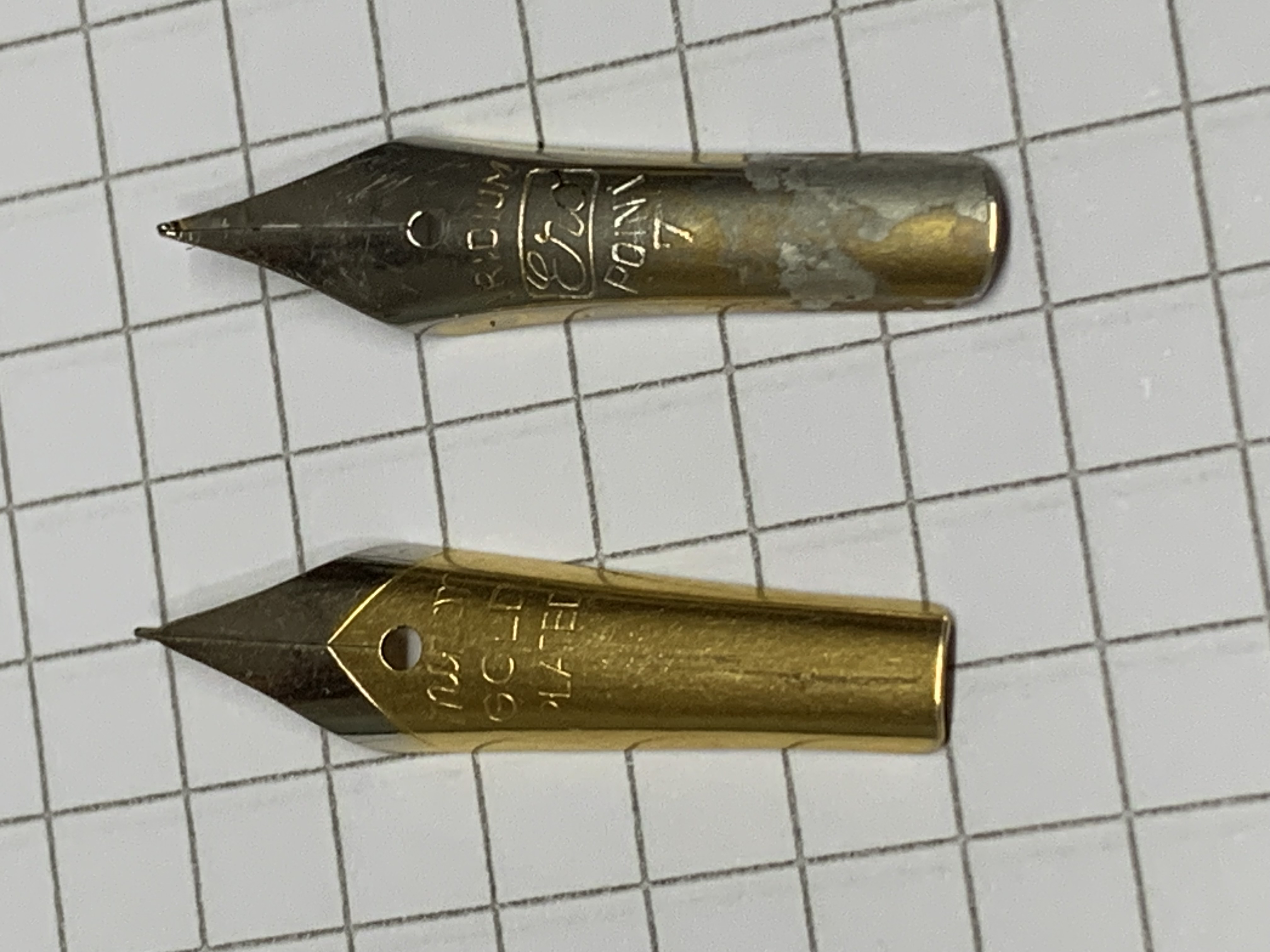 Uno ha perso quasi tutta la doratura, ma non è corroso, è un F abbondante, piuttosto cedevole, con la pallina di iridio al contrario, ovvero sulla parte superiore del pennino, per scrivere in reverse anche premendo come per la carta copiativa.