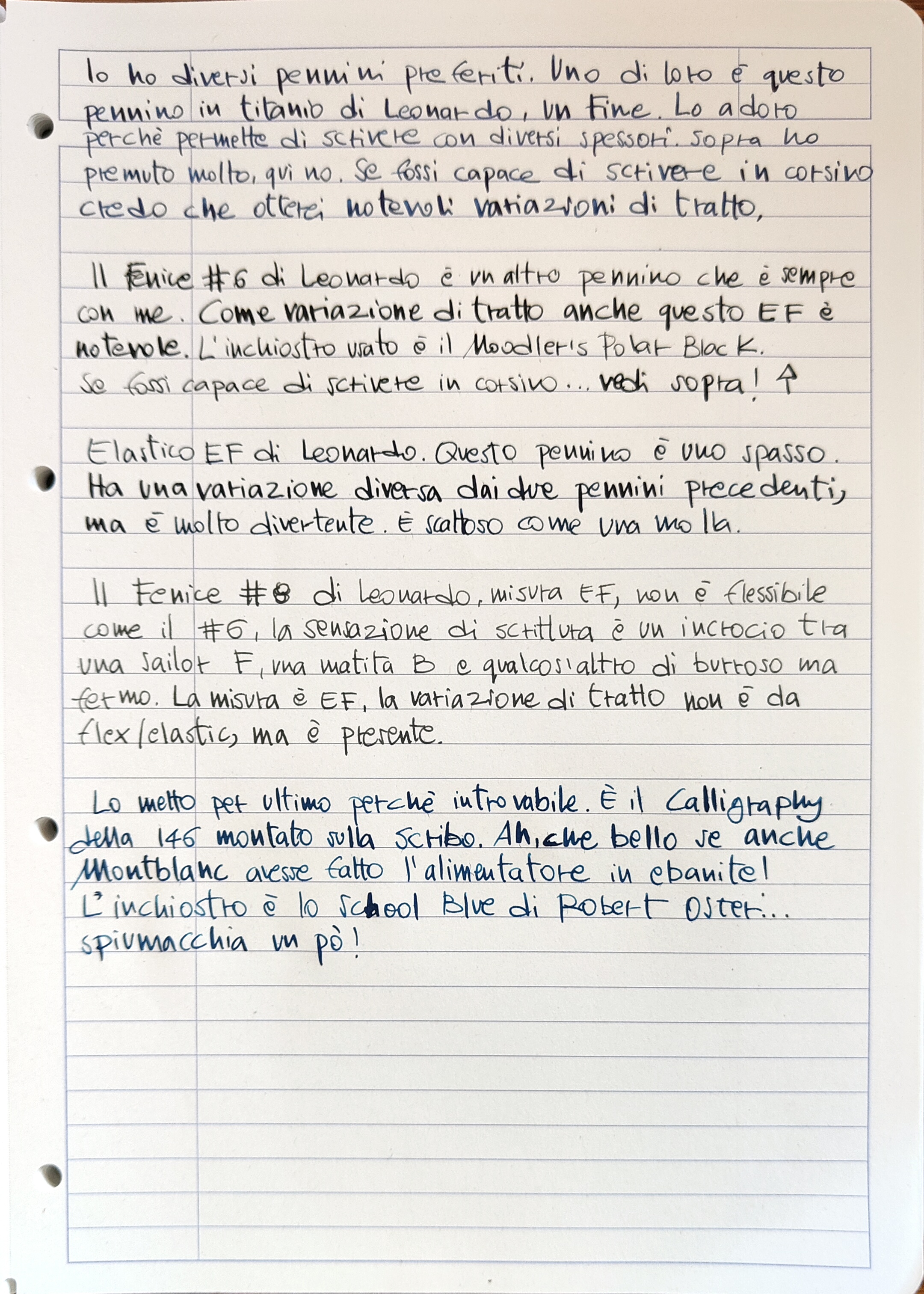 A parte gli EF (ma mai dire mai), mi piacciono tutti, ogni pennino per un uso diverso. Preferisco acciaio rigido, ho un vero flex vintage ma non riesco ad usarlo nel quotidiano.
