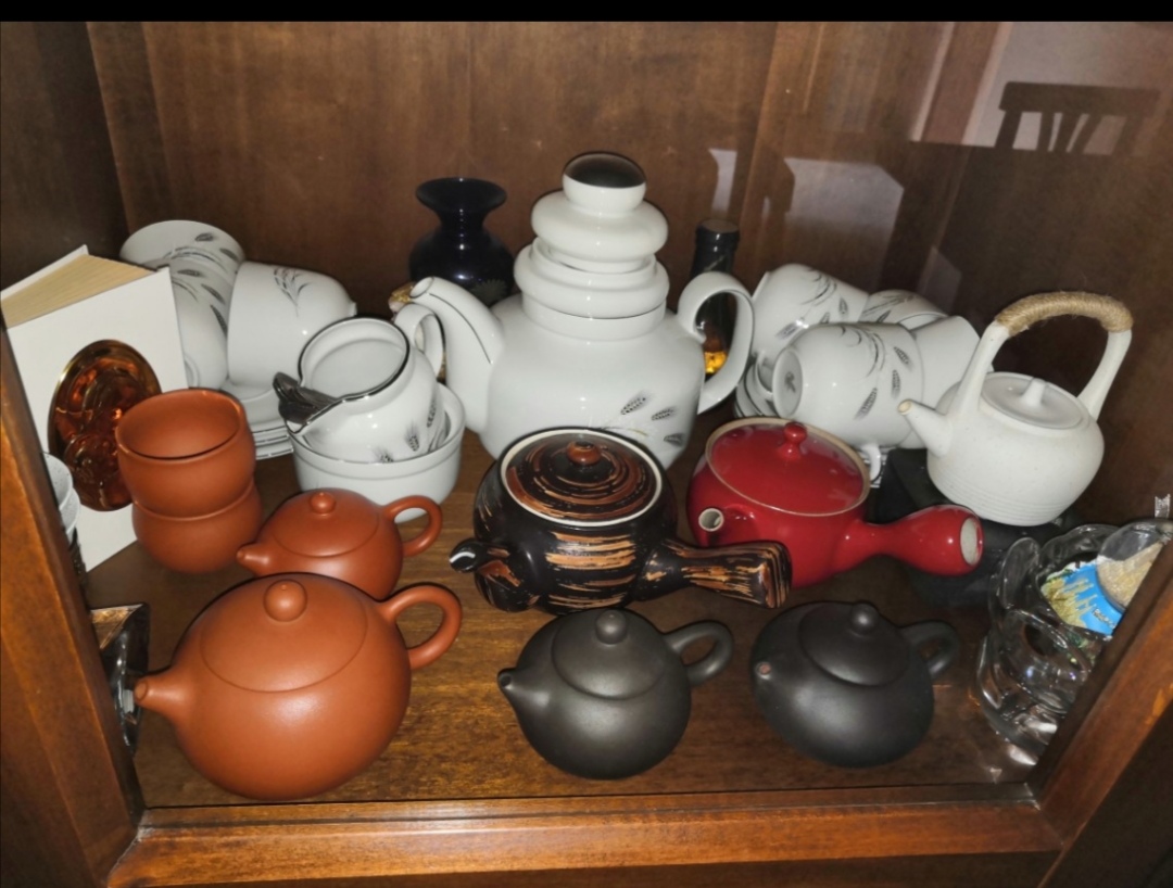 Io non sono un collezionista, sono un utilizzatore. E delle cose che uso per passione, mi piace averne più di una, per diversificare e usarle a seconda dell'umore, dell'uso da farne, del supporto... Quindi, oltre penne e inchiostri, mi appassionano gli orologi (economici, i fondi sono quelli che sono) e li uso in base a come mi vesto, al clima, a come mi sveglio... Poi mi piace bere il tè, in foglia, anche a lavoro. Quindi ho una piccola raccolta di tè, teiere, oggettistica, contenitori per i tè... Ecco un esempio degli oggetti che uso per godere di questa fantastica bevanda. Alcune teiere sono dedicate a un solo tipo di tè, quelle marroncine ad esempio. Quella bianca, invece, è l'ultima arrivata e fa il tè benissimo.