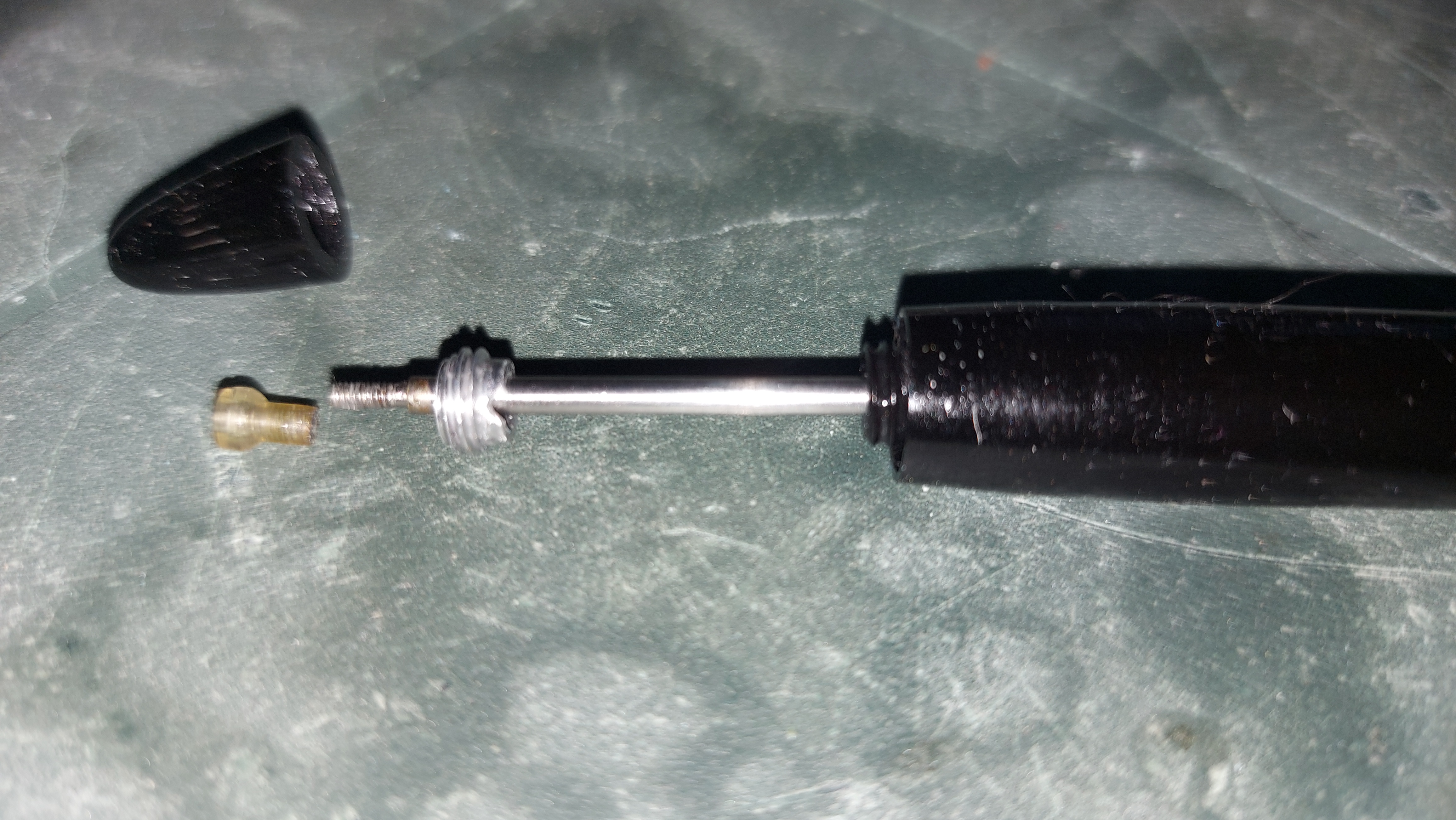 Per quanto riguarda la risposta di @Ottorino, mi spiace, ma forse c'è qualche piccola incomprensione: proprio leggendo quello che avevi scritto tu e confrontandolo con le foto dell'altra discussione mi aspettavo di trovare la chiusura del serbatoio (o i suoi resti) al fondo della penna una volta rimosso l'alberetto, cosa che non è saltata fuori.
