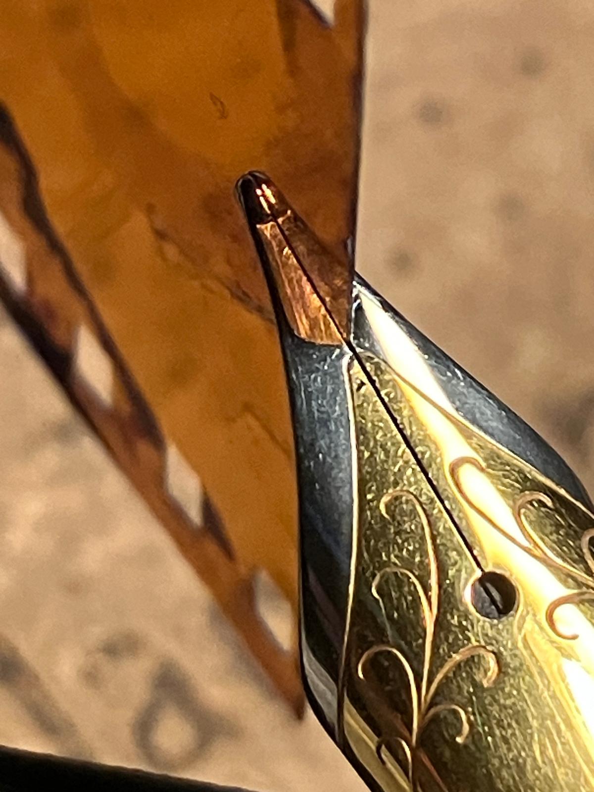 Ragazzi la fenditura verso il foro di sfiato viene fatto tagliando il pennino dalla punta verso la base. Non esistono pennini con le punte saldate, non ci sarebbe alcun passaggio per l'inchiostro.