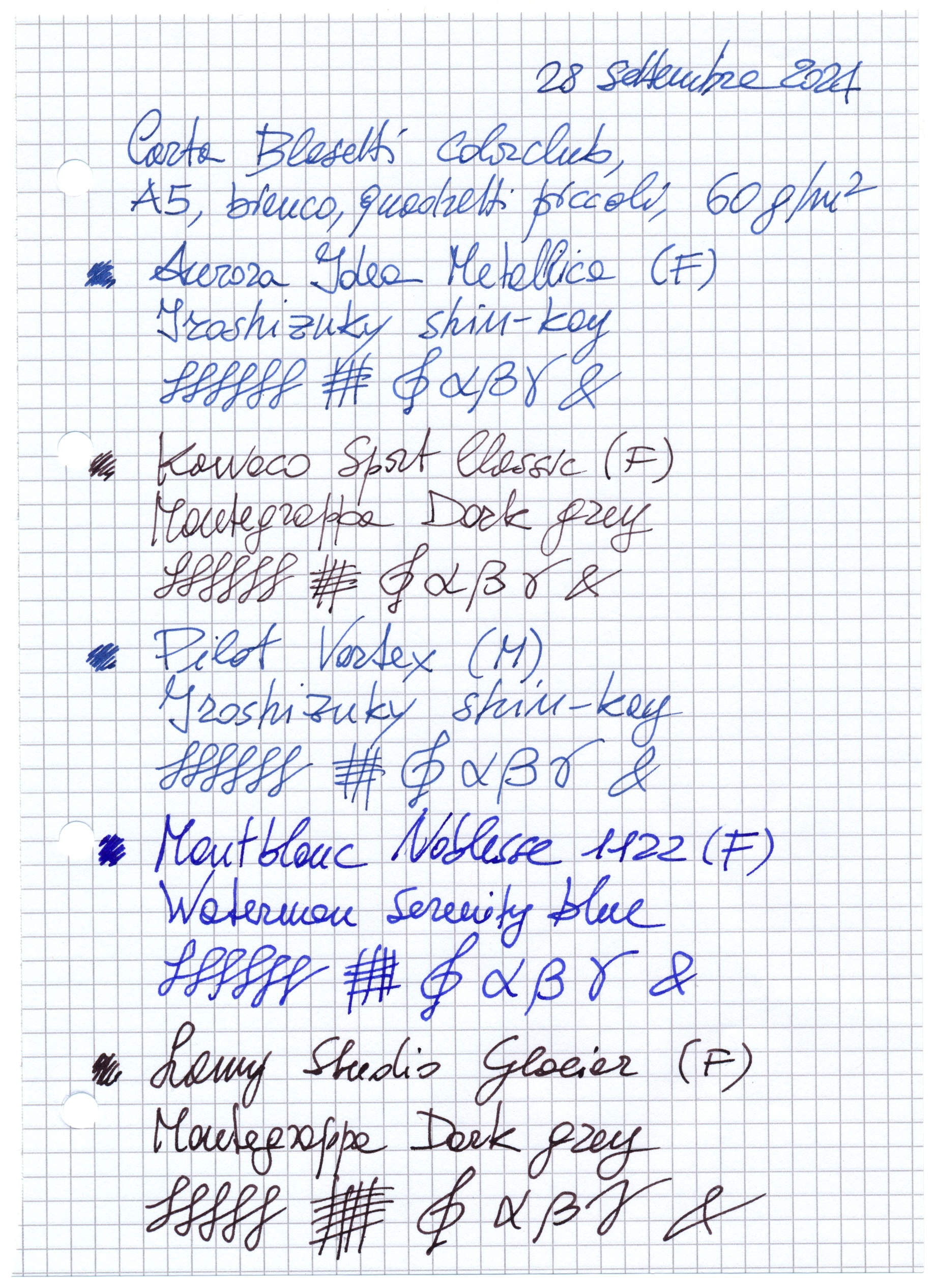 La mia MB Noblesse è la prima versione, pennino in acciaio, fine. La usavo con le cartucce Pelikan 4001 Roya Blue, con cui va a meraviglia. Va bene anche con il Waterman Serenity Blue, devo usarla ancora un po' per giudicare bene, ma per ora l'abbinamento con il 4001 mi sembra meglio.mastrogigino ha scritto: ↑sabato 28 settembre 2024, 15:39 Io ho una Montblanc Noblesse con pennino F a 18k, col Waterman Serenity Blue è uno spettacolo.