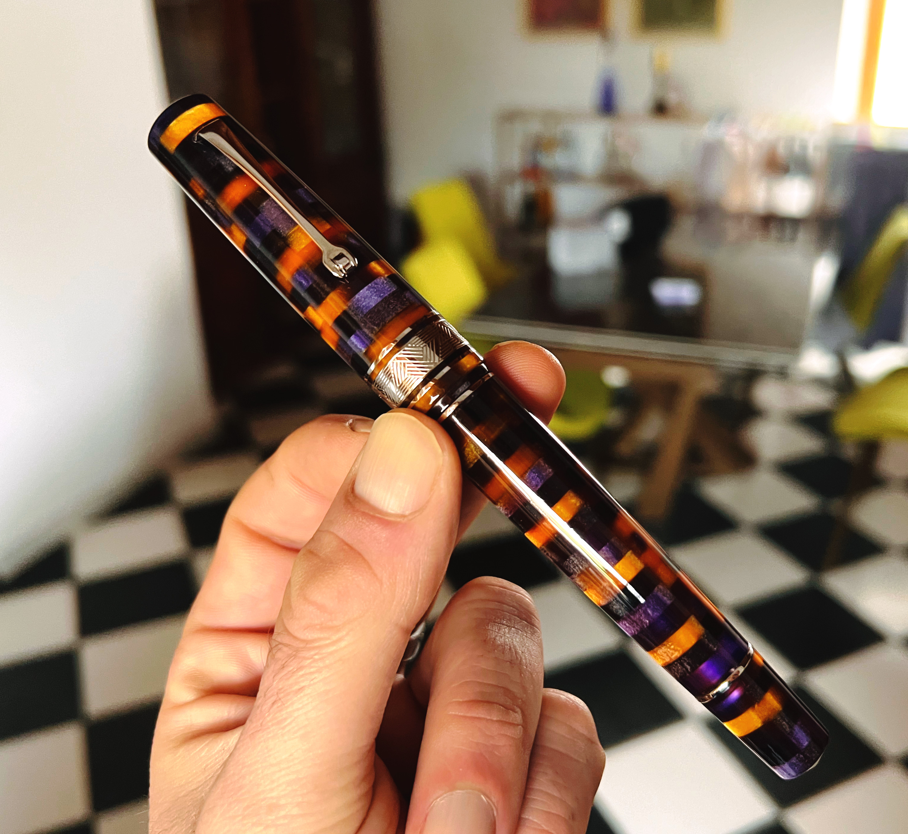Le dimensioni sono, a mio gusto, perfette. E' robustella come una MB 149 e qualche mm più lunga ! Ma è la resina ad affascinarmi. La lavorazione a mosaico mi piace tantissimo e sarei curiosissimo di capire come hanno creato la barra da cui hanno tornito la penna.