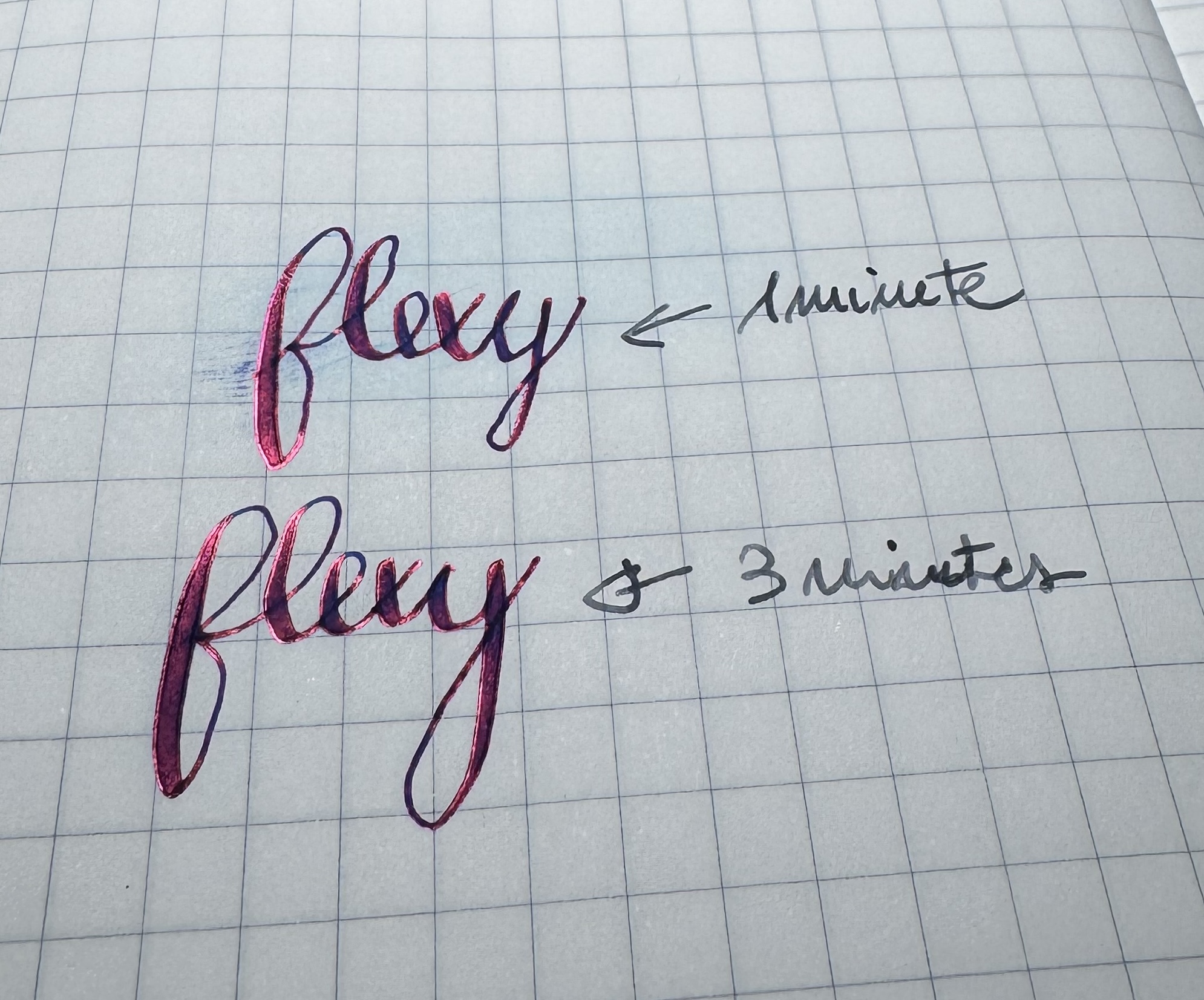 Io ho tanti inchiostri che asciugano lentamente (diciamo in secondi) ma per me non è un problema (ma sono destro, ovviamente per un mancino la situazione è diversa). Nel mio caso, appena finisco una pagina o un paragrafo aspetto diciamo 30 secondi e ho fatto, questo anche su Tomoe River. Perché il braccio alzato? Scusa ma sono curioso. L'eccezione sono i flussi di inchiostro quasi 3d che ho da penne flessibili, lì devo aspettare un poco di più ma ne vale spesso la pena per il risultato.