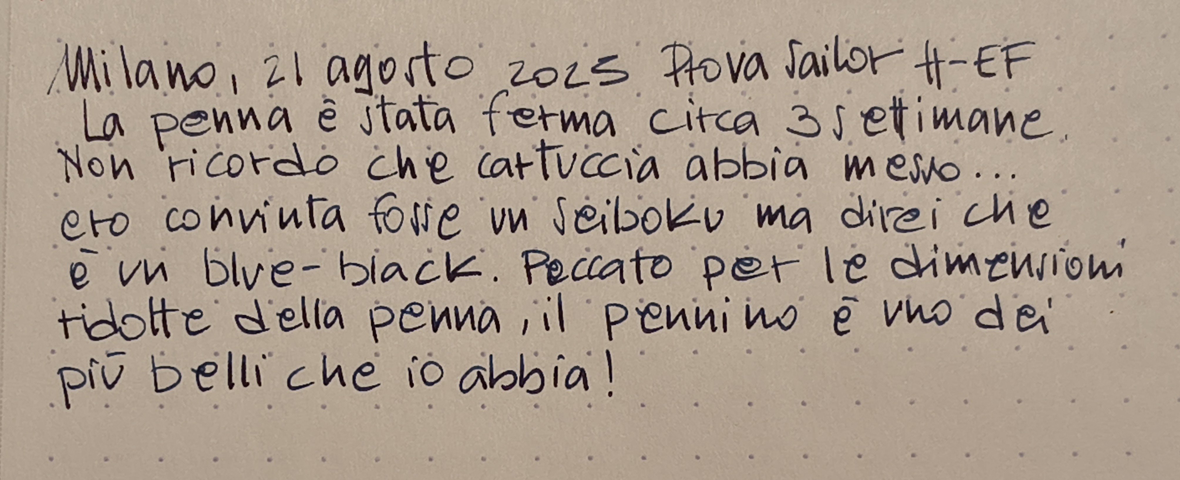 Le giapponesi io le vedo bene con inchiostri giapponesi perché di solito hanno flusso abbastanza trattenuto e gli inchiostri giapponesi (di solito) sono più fluidi. Anche a me è piaciuto il Sailor Blue Black, ci vedrei bene anche un Iroshizuku (Tsuki-yo? Shin-kai?), o anche il Bleu Austral della JH.