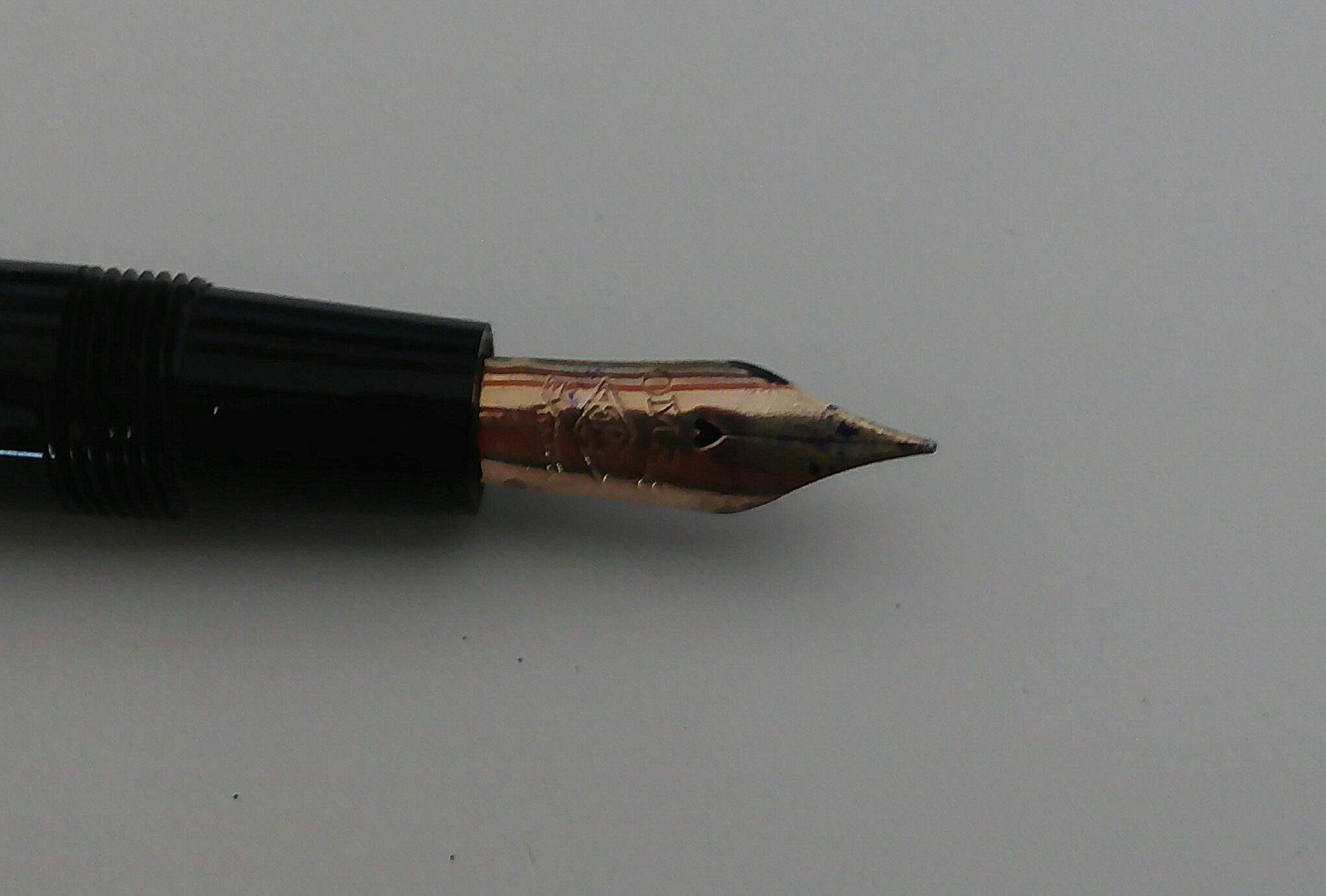 Il pennino, però, - un magnifico semiflessibile in oro - si dimostra veramente ma veramente troppo stretto. In pratica non scrive. L'analisi con la mia lente 30X conferma la cosa, in pratica gli ultimi 2-3 mm del canale sono di fatto a contatto. Strano, perché il pennino non sembra deformato, per cui il "difetto" parrebbe di fabbrica, e non dovuto a cadute o danni accidentali.