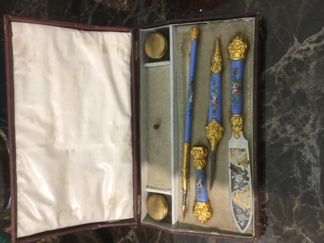 Bando agli scherzi, bentornato! Il set che hai fotografato è incantevole. Posso chiederti se la parte azzurra decorata è in porcellana, o magari in metallo laccato?