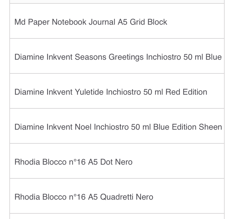 Il mio ultimo acquisto.. di materia prima! Ho preso l’ultimo notebook MD Paper disponibile, per fortuna. Già che c’ero, alcuni inchiostri che mi hanno molto soddisfatta nel 2019 (Inkvent calendar blu di Diamine) più uno del calendario ultimo, rosso, che non ho preso ma che ho visto recensito sul web. Il colore Yuletide per me è come un magnete.. e sono curiosa di paragonarlo al Roman Bronze Oxidation di Stilo & Stile. Mi sa che sono simili (ma il calamaio coi piedotti era irresistibile