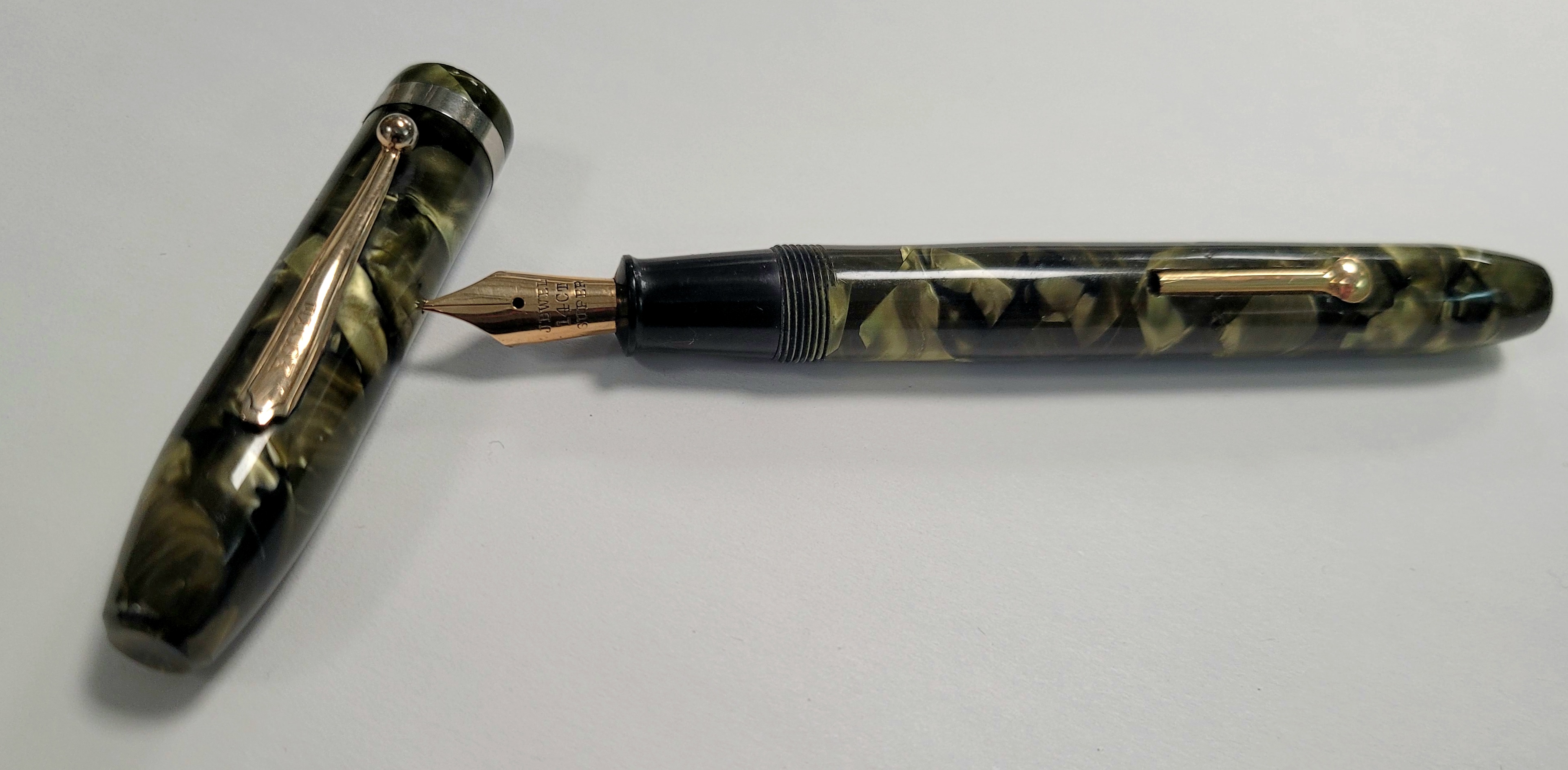 Celluloide verde/nero/avorio marmorizzato e pennino bello flessibile.