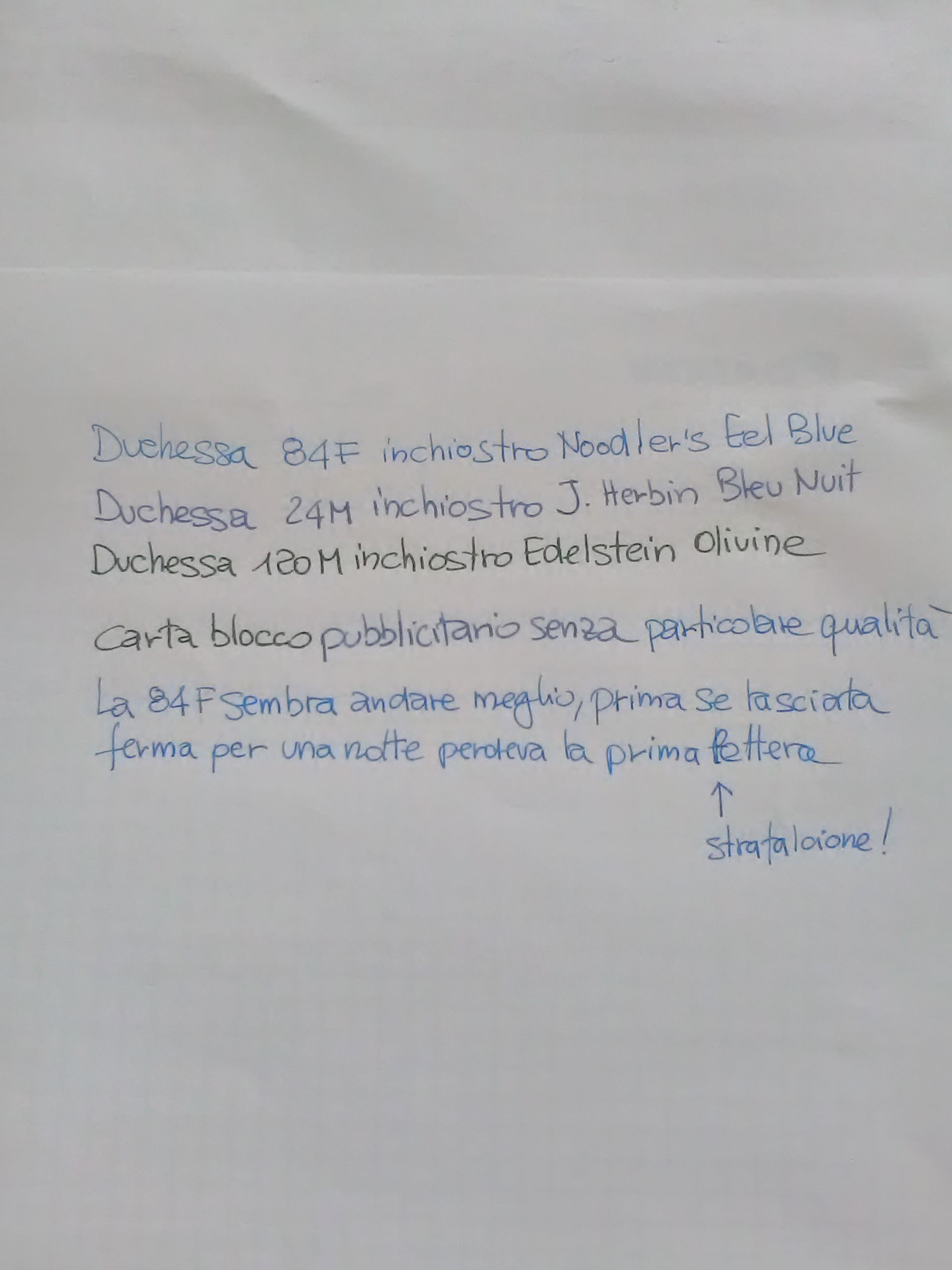 L'hai lavata prima di mettere l'inchiostro?WGS84 ha scritto: ↑martedì 16 agosto 2022, 11:05 Restando sul tema della scelta di un inchiostro con una buona resa sulla Duchessa, sto cercando di farmi un'idea delle sue caratteristiche. Da principiante, però, ho qualche difficoltà a capire flusso e quantità di inchiostro rilasciato dalla penna: mi aspetto che con un flusso maggiore venga rilasciato più inchiostro e che il colore sia più saturo (e che su carte di scarsa qualità ci possa essere qualche problema). Mi lascia perplesso però il risultato ottenuto, a parità di inchiostro (Parker blue-nero) confrontato ad una Pluminix: mentre il tratto lasciato da questa mantiene un colore blu-nero e non si allarga troppo, quello rilasciato dalla Duchessa è più espanso e slavato, quasi verde...