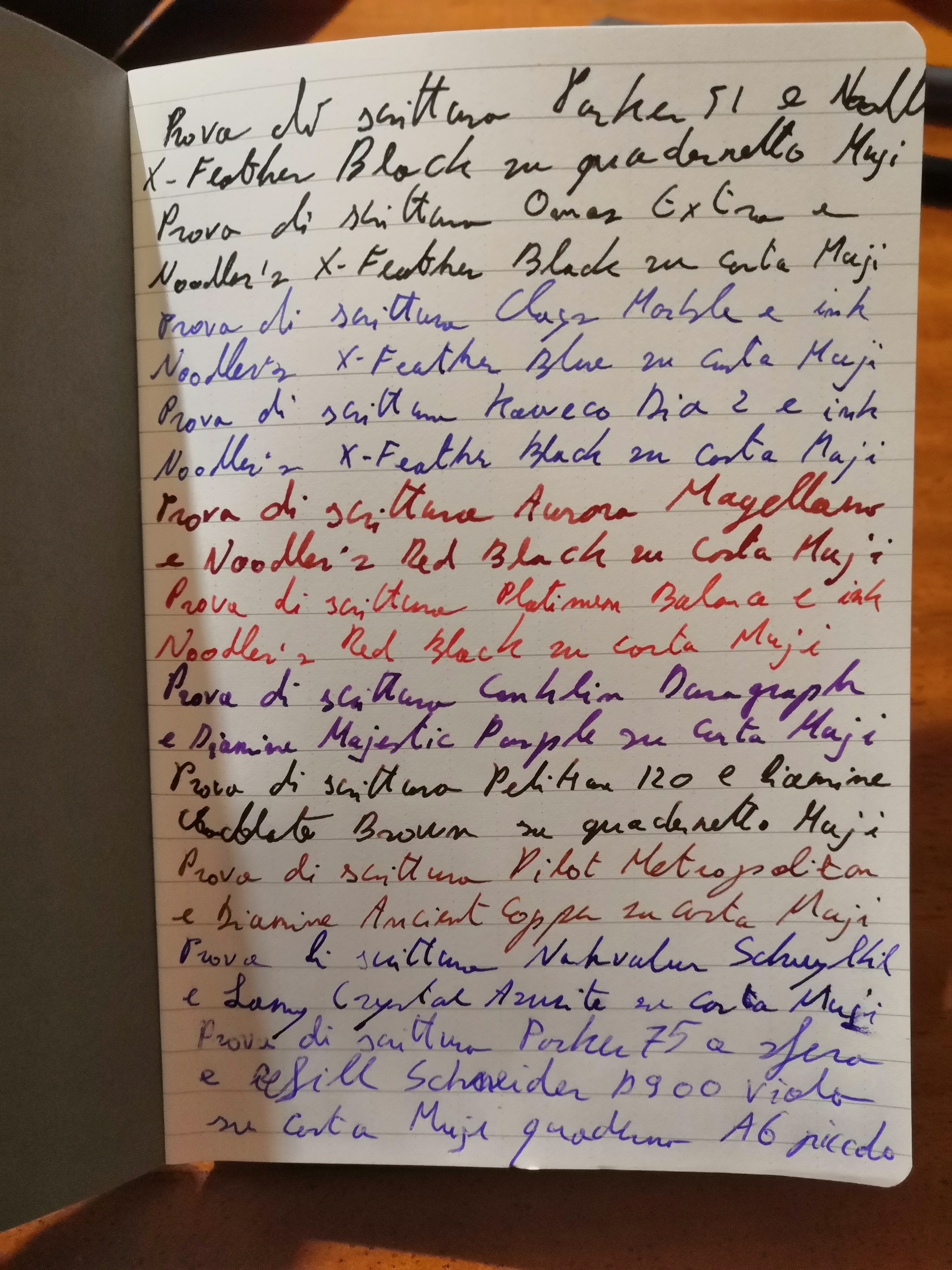Qualche riga di prova con le penne cariche al momento su un piccolo quadernetto A6 preso al Muji. La carta è davvero ottima, non trapassa nulla, e oltre le righe c'è una finissima e per nulla invadente griglia a quadretti. Mi pare davvero una ottima carta. Sull'ultimo rigo scritto con la stilografica c'è una piccola sbavatura perché credo di non saper più tenere correttamente una biro :D