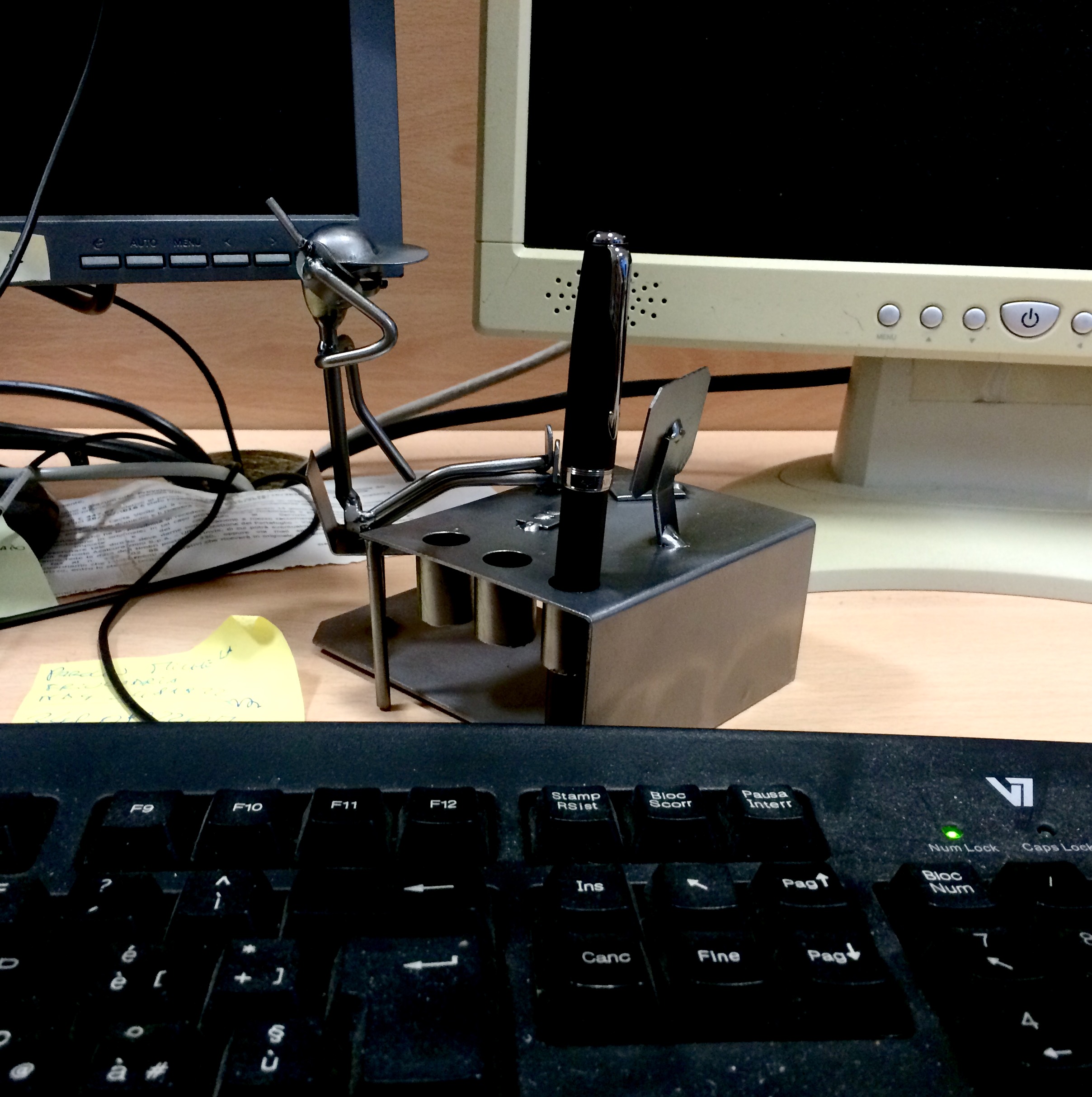 È fatto in metallo riciclando viti ed altri componenti metallici ormai inutilizzabili; ovviamente la forma ha a che fare col mio lavoro, in quanto in ufficio - oltre ad usare sempre il computer - si telefona parecchio.