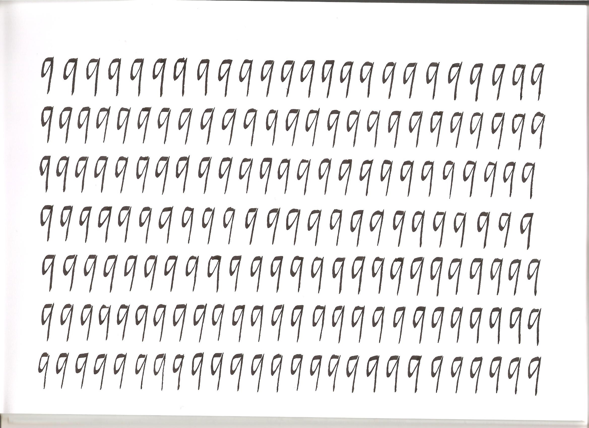 Sinceramente pensavo di tenere l'angolazione corretta: all'inizio di ogni lettera lo è (controllo sempre), evidentemente l'attenzione alla forma delle lettere mi distoglie dal mantenere il pennino con l'inclinazione costante, probabilmente le curve nelle lettere mi portano a curvare anche la penna.