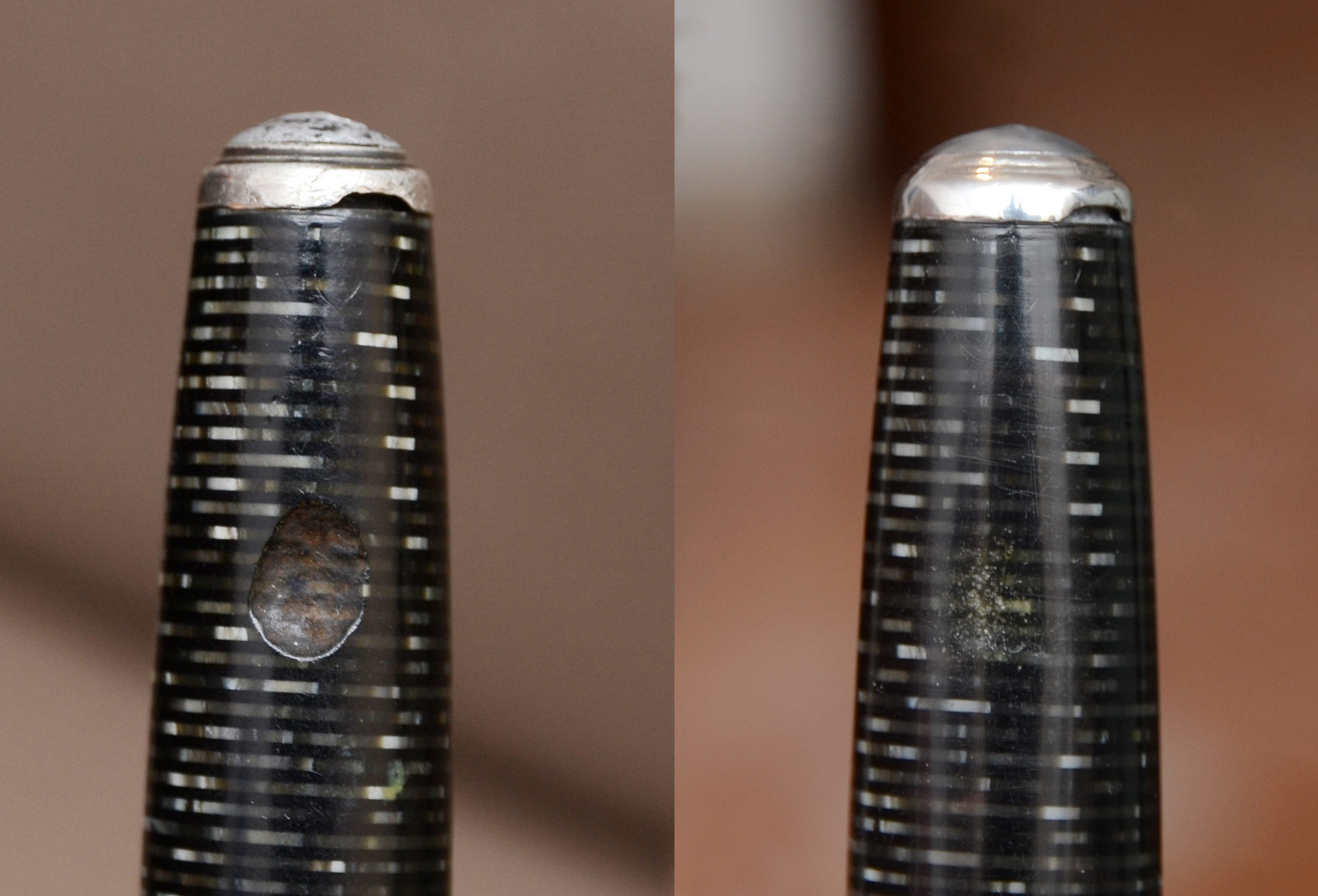 Normalmente la parte filettata che si innesta nel fusto della penna è di metallo e quindi dovrebbe essere attaccata dal cloruro ferrico. Purtroppo per smontarla se non si possiede un attrezzo specifico che si impana nella filettatura esterna e permette poi di fare forza per svitare la filettatura interna si rischia quasi sicuramente di danneggiare qualcosa. In mancanza d'altro si potrebbe ricavare un supporto per svitare il gruppo del caricamento, opportunamente poi protetto con della gomma, anche da un blind cap della giusta misura preso da un rottame, ma sicuramente le pinze adatte favoriscono il lavoro e, come dice Peppe, alcune volte risulta difficile anche con quelle. Insomma sti caricamenti delle Vacumatic, come si dice dalle nostre parti, sò proprio un "d..o ar cu.o"!!