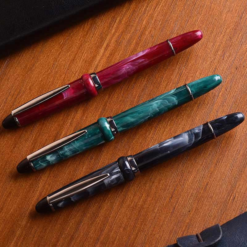 Boh, le mie due sono felicemente arrivate senza graffi. Il cappuccio a scatto chiude bene, e postato sul retro, pur non avendo un fermo vero e proprio, mi pare stabile, per il momento (è da poco che ne utilizzo una, l'altra è ancora intonsa). Pennino F alla Pelikan, scrittura molto buona.