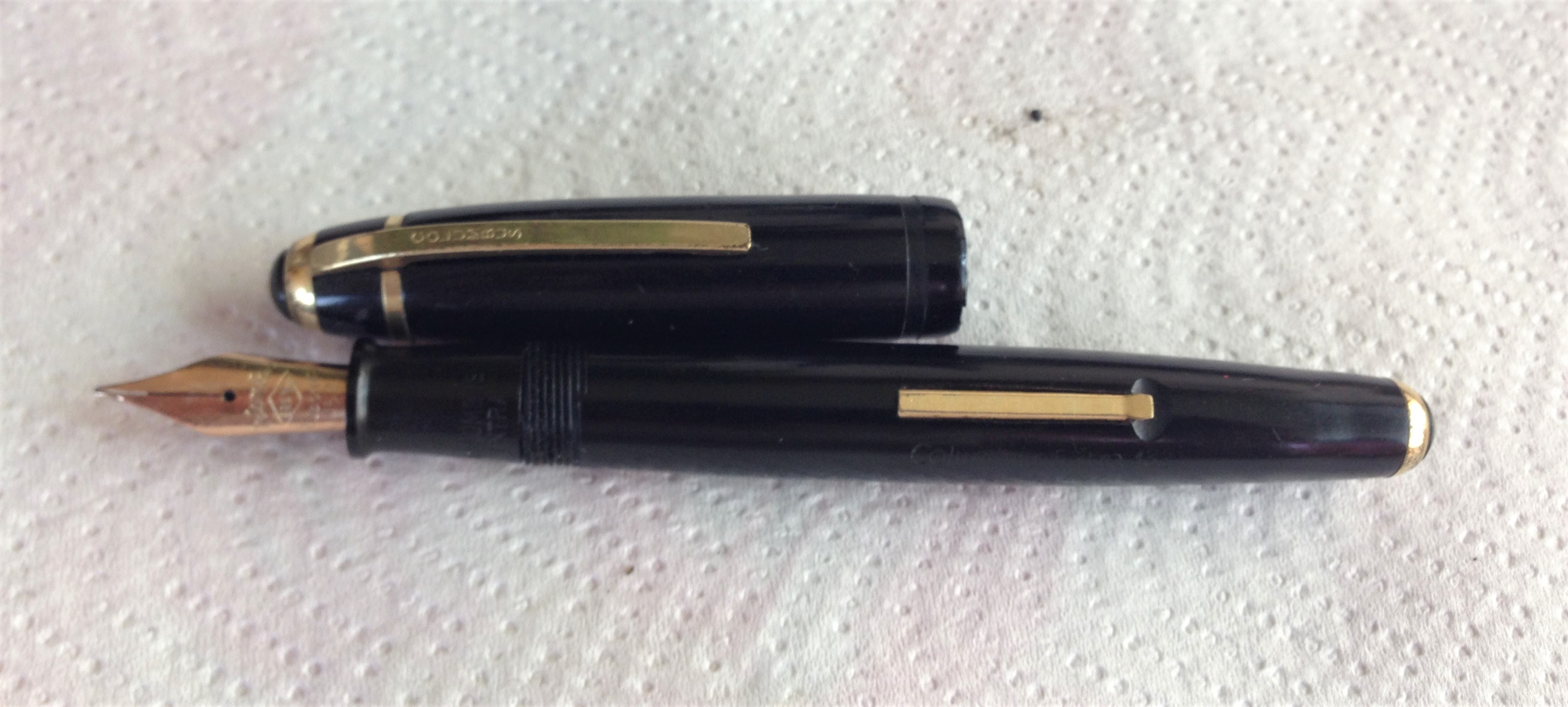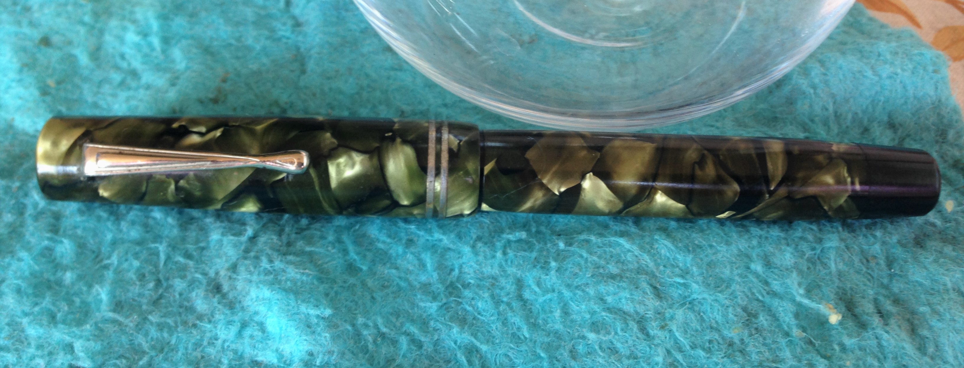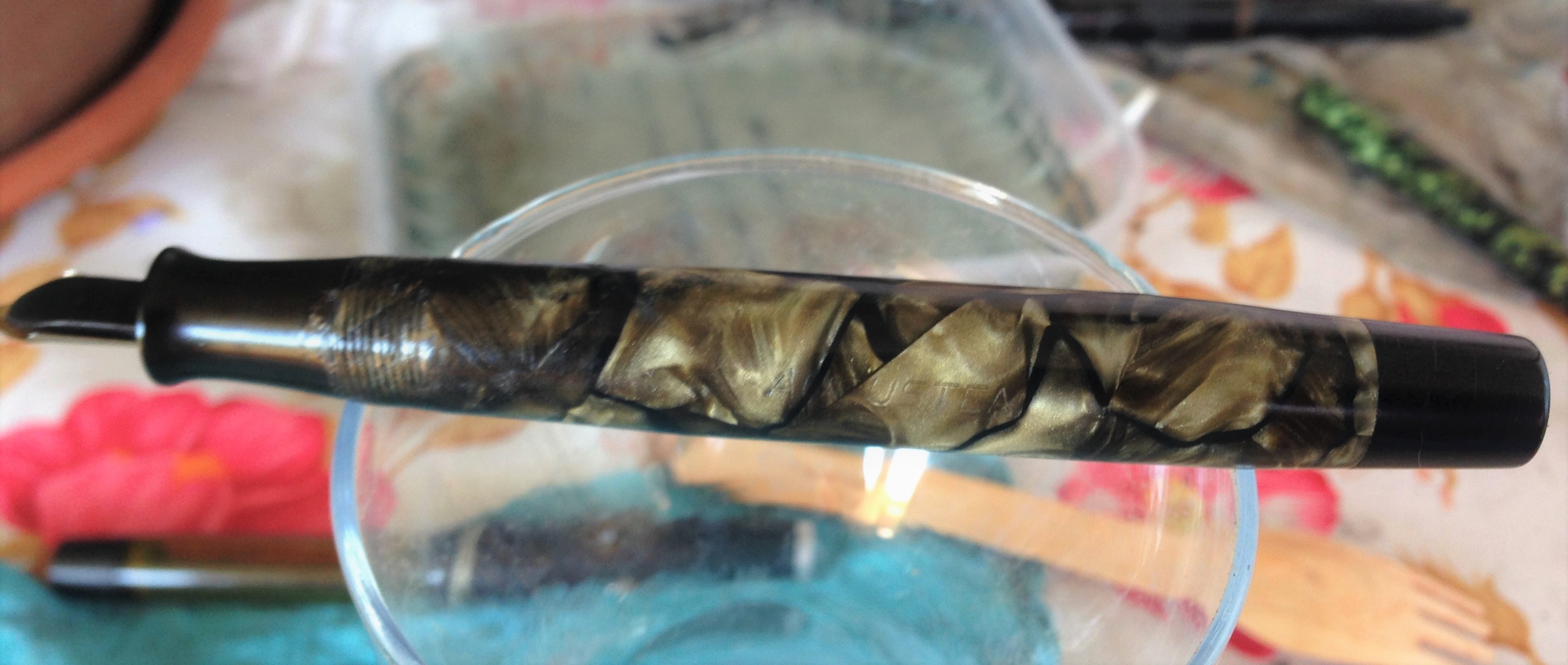 Semplice, il proprietario originario della Augustea aveva pensato bene di cambiare il sacchetto e poi incollare il tutto con colla cianocrilica, i risultati si vedono sul colletto e un po' anche sul fusto, dove sono intervenuta per togliere lo spessore usando micromesh e olio di gomito, il puntale è saldamente incollato al fusto ma per il momento ho lasciato perdere, perché alla prova la penna carica perfettamente. Mancava anche il pennino sostituito con un Gladio, l'unico che adattasse all' alimentatore.