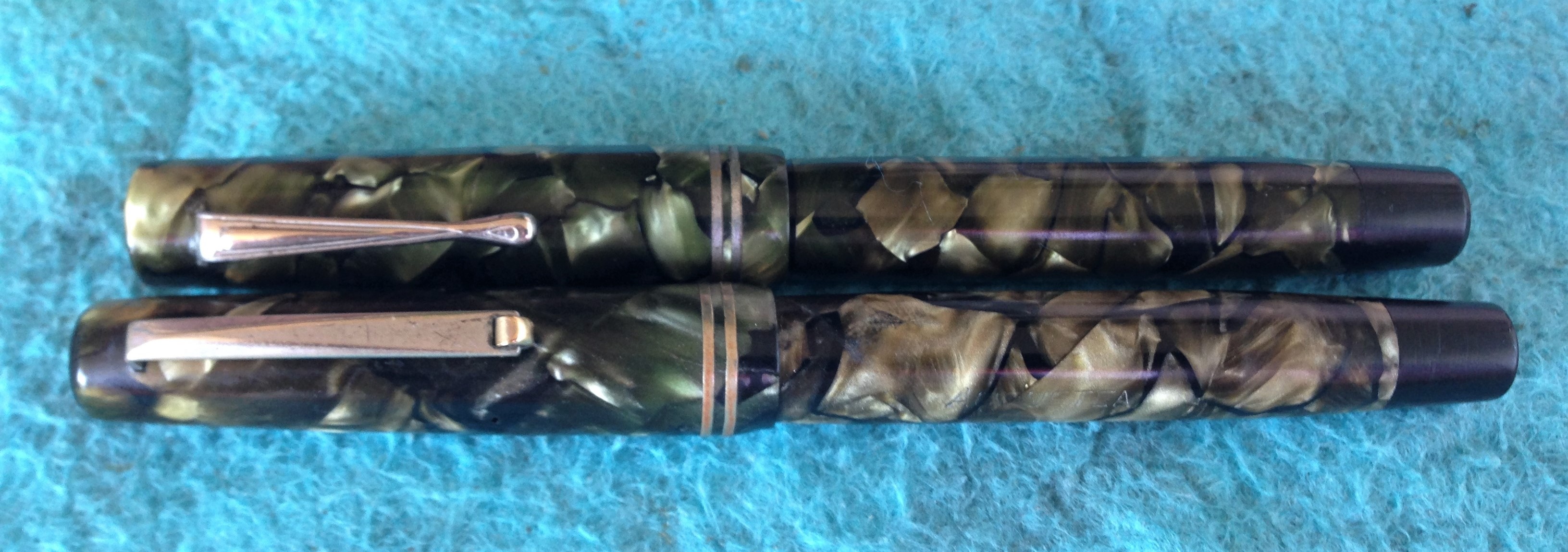 Augustea e Littoria sono chiaramente stilo di epoca fascista, i nomi non lasciano dubbi (origine Columbus?) (o Aurora), le penne hanno molto in comune eome si può notare dalla foto, il particolare diverso che salta all’occhio è la clip montata sulla Littoria ma lì sono intervenuta io che non avendo nessuna clip che potesse andar bene, ho saccheggiato un portamine di plastica con la clip ad anello, tagliato l' anello ho scartavetrato fine ad avere un attacco che entrasse nella fessura, facendo in modo di lasciare due puntine più larghe che andassero a fermare la clip nell'interno del cappuccio e poi una punta di colla "Cocoina liquida" che un domani, se recupererò la clip originaria,verrà via senza problemi.