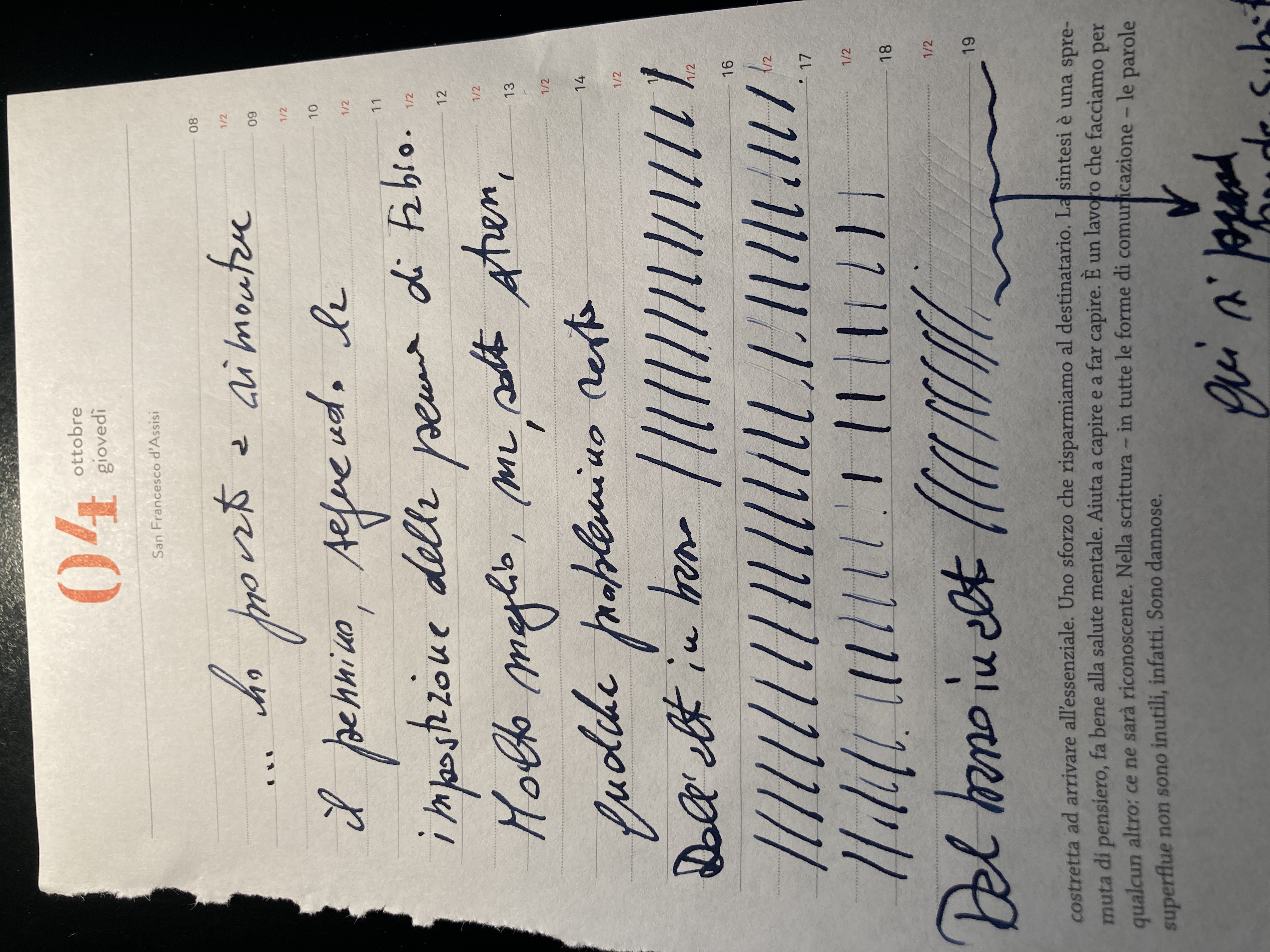 P.S. vedendo il tuo scritto credo di capire che le linee verticali tu le abbia tracciate con una certa pressione e velocemente. Prova a scrive un po’ più lentamente e vedi che succede. Facci sapere![]()