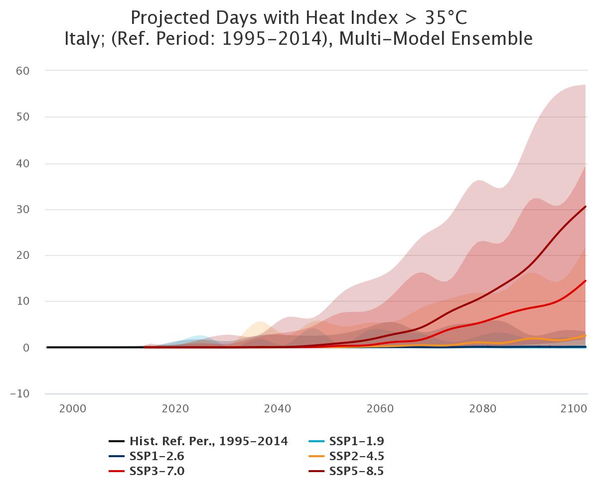 Le temperature future (gli scenari SSP1 1.9 e 2.6 sono da ignorare visto che sono praticamente irrealizzabili): E i giorni con medie sopra i 35 gradi: Dati: https://climateknowledgeportal.worldban ... ntry/italy