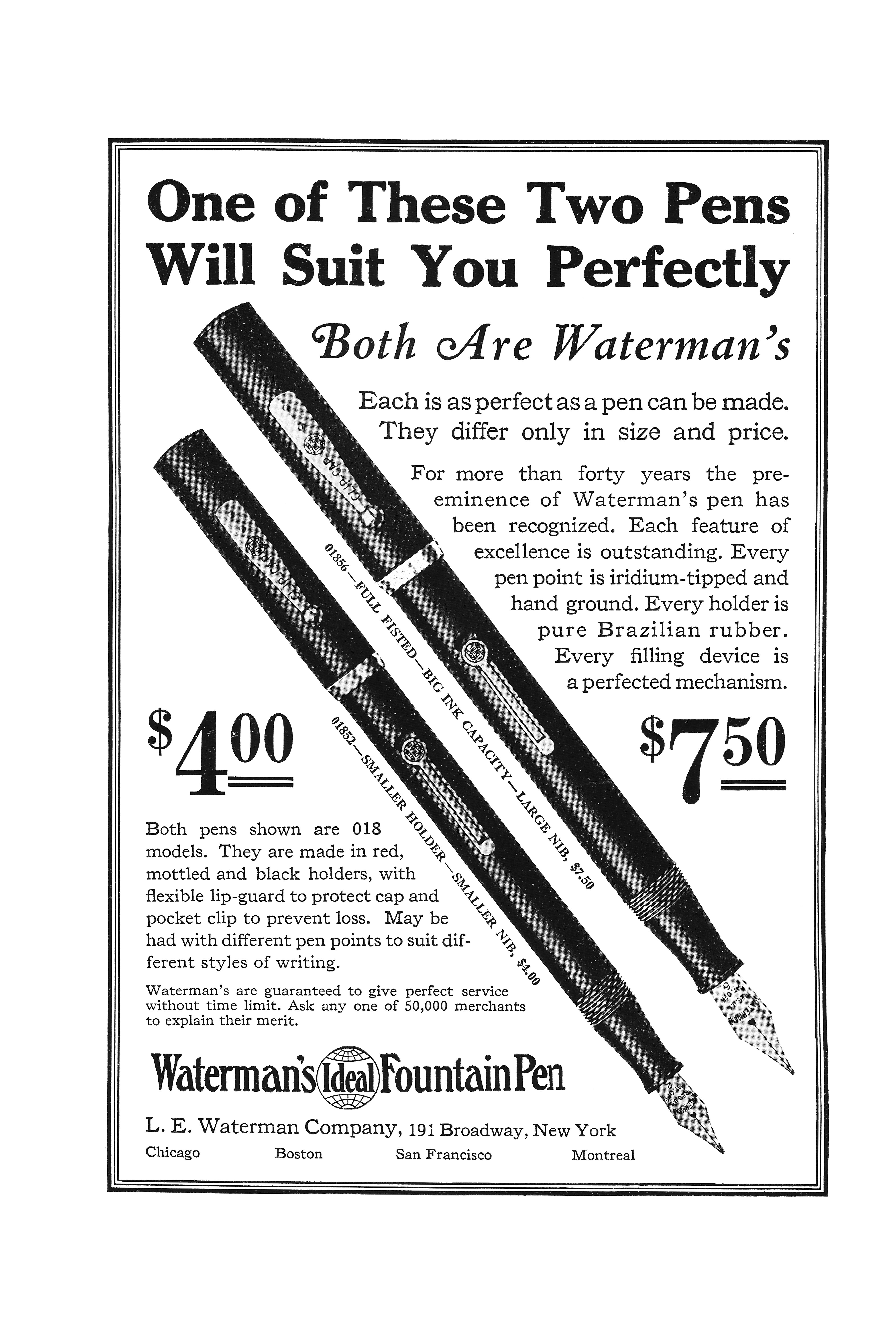 Come apprendiamo dal retro del foglietto (che non utilizza caratteri “a pressione”), il committente principale della pubblicità era il Rappresentante inglese della Waterman’s,