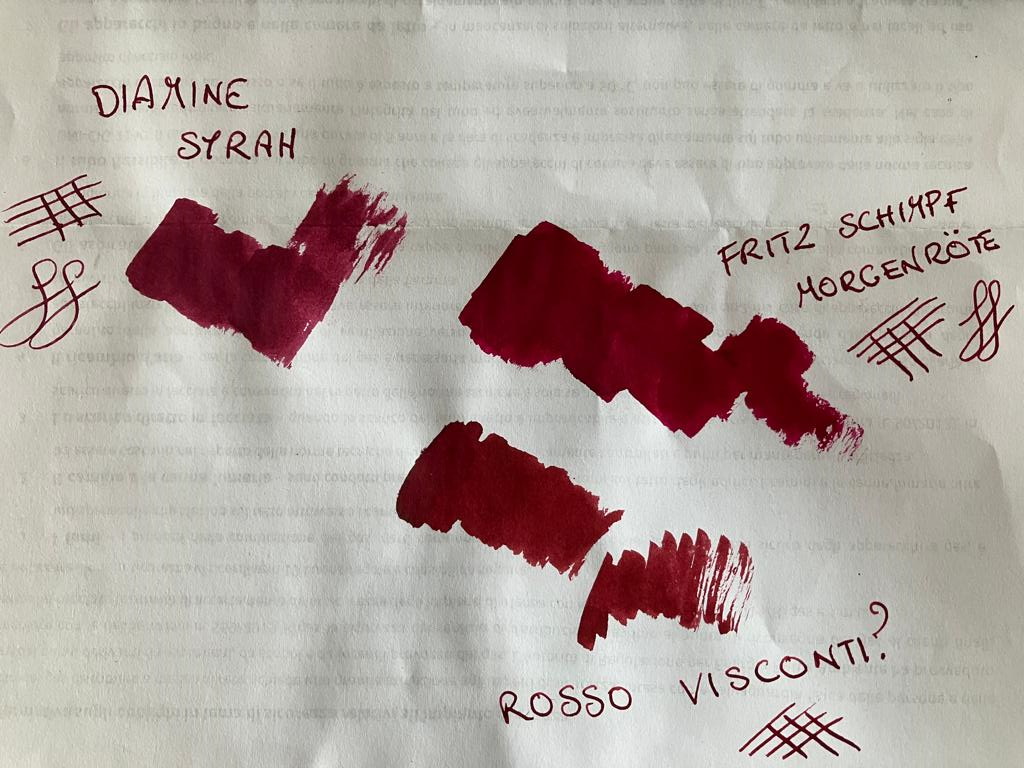 Non sono per nulla un amante dei rossi, il Morgenrote l'ho ricevuto in omaggio con l'acquisto di una stilo da Fritz Schimpf, e ho scoperto che se proprio devo usare un rosso questo mi piace (solo per la cronaca anche il Visconti Rosso e il Diamine Syrah erano omaggi per acquisto di penne...).