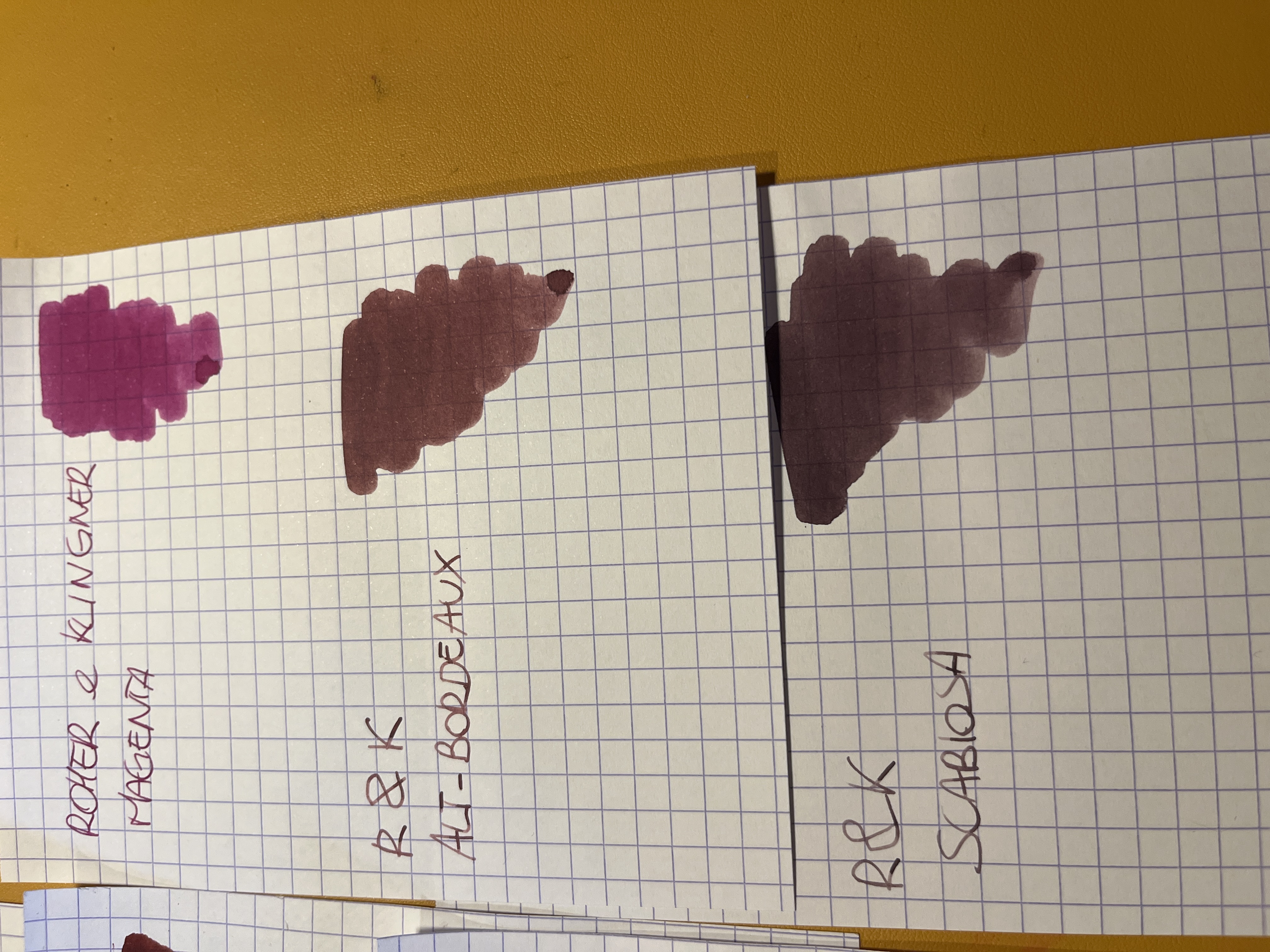 nella mia foto si nota, ma poco, sul foglio reale la differenza è un po' più accentuata, mentre il Syrah è decisamente più violaceo degli altri due, il rosso Visconti vira leggermente al rosso sangue (che di viola non ha proprio nulla) mentre il Morgenrote ha quella appena percettibile sfumatura lampone che lo distingue.