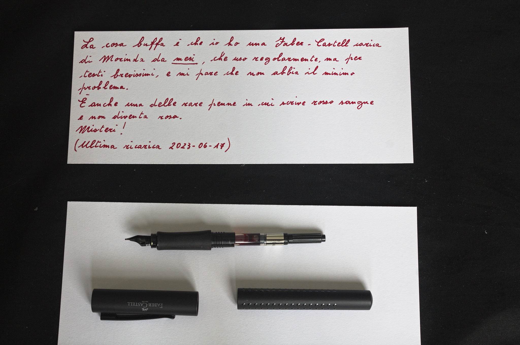 La cosa buffa è che io ho una Faber-Castell carica di Morinda da mesi, che uso regolarmente, ma per testi brevissimi, e mi pare che non abbia il minimo problema.
