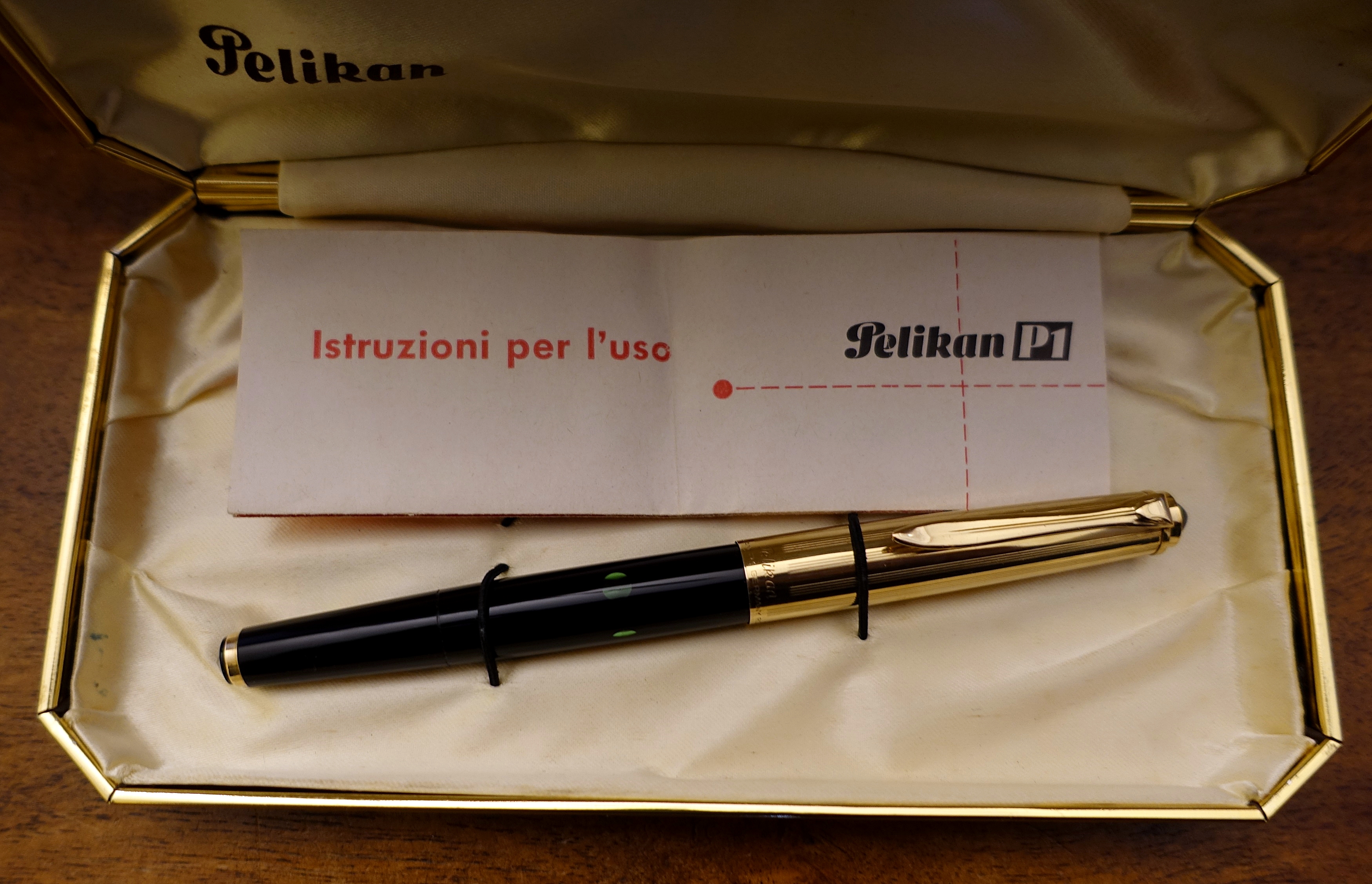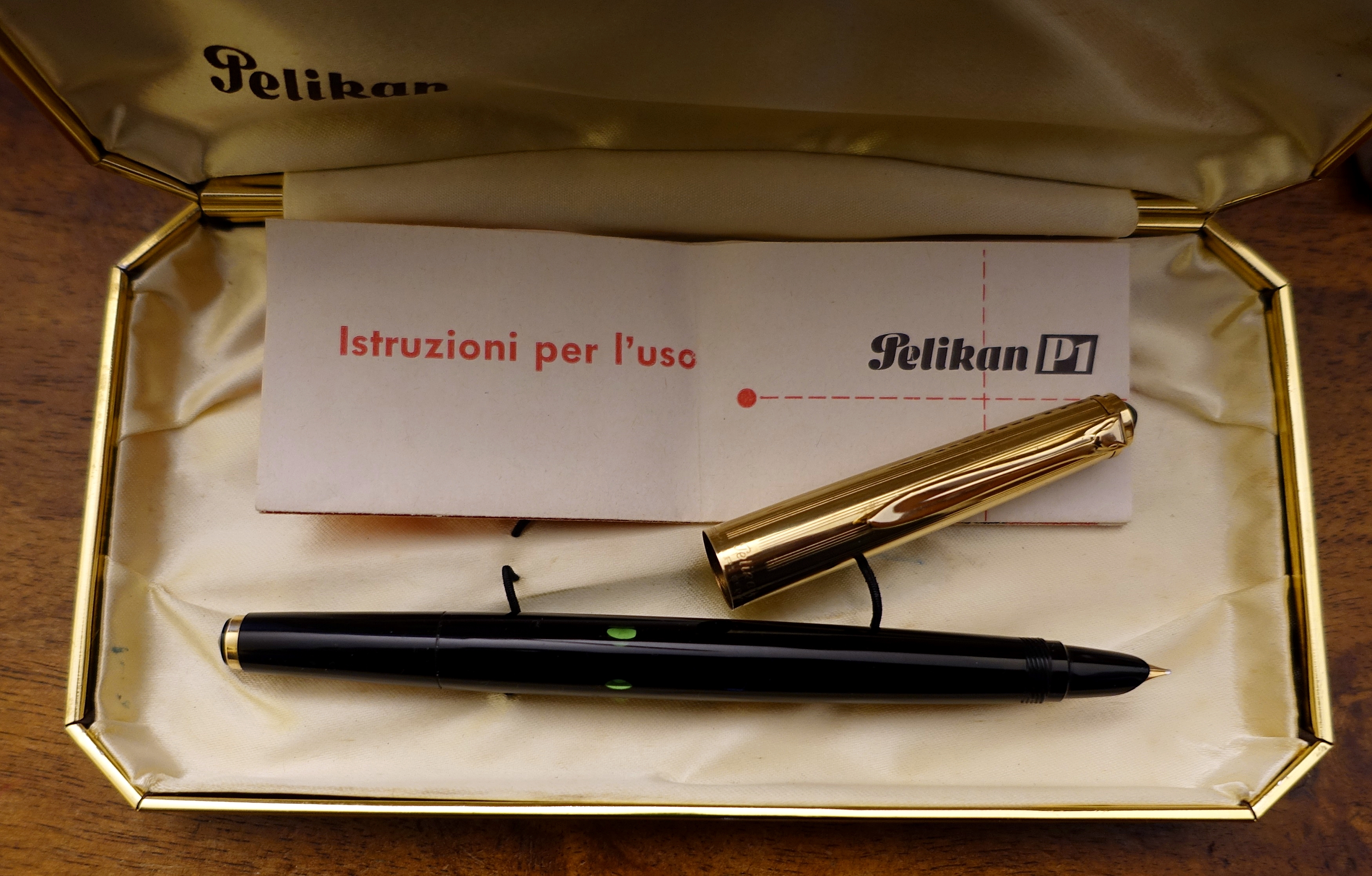 Uscendo dai canoni classici Pelikan, c'è anche questa P1 Doublè L (1962/63) pennino carenato, livrea nero oro, capacita riempimento ml 1,5 l' equivalente di tre cartucce.
