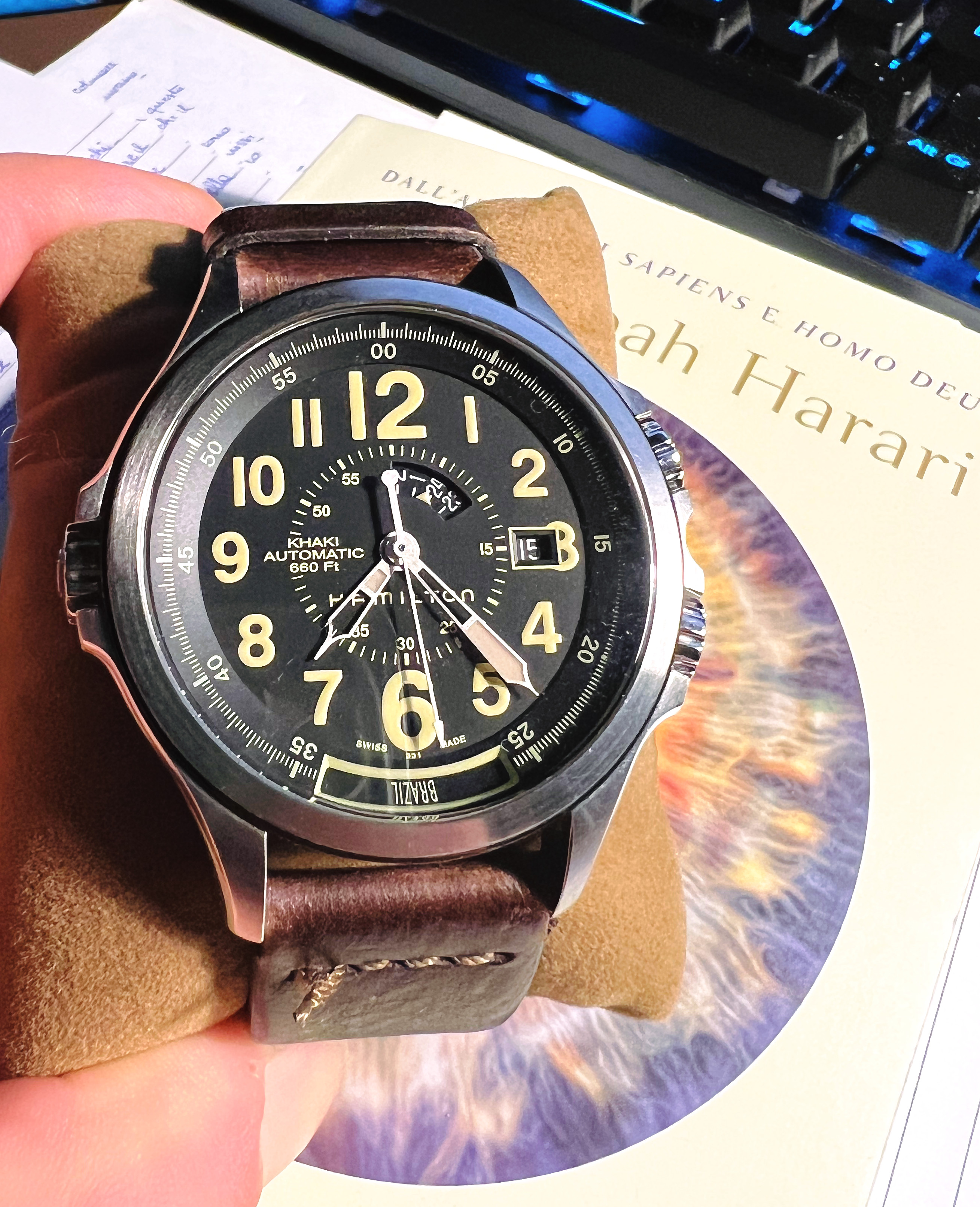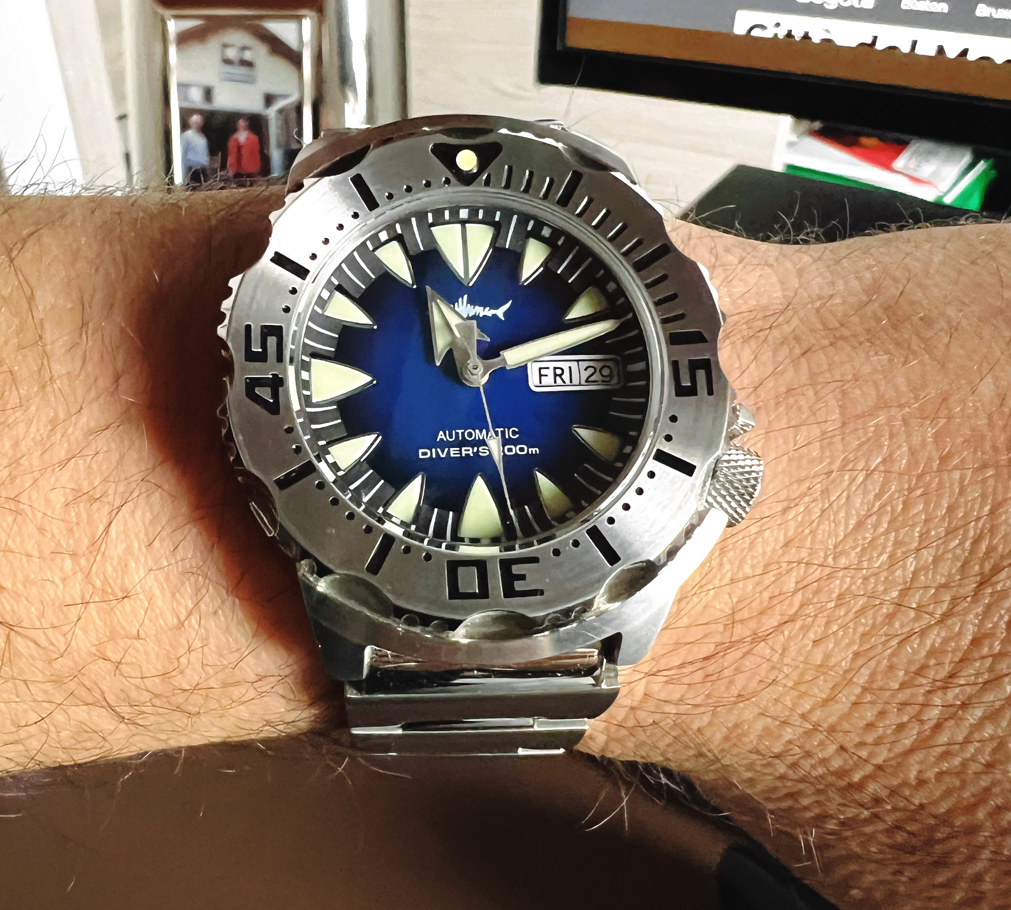 Oggi al polso un cinese, di marca Heimdallr, preso perchè è un Seiko Monster vecchia maniera (non i nuovi baby monster 100m), ma con un bel quadrante blu e vetro zaffiro. Il movimento è il classico Seiko NH35 che non va male per nulla.