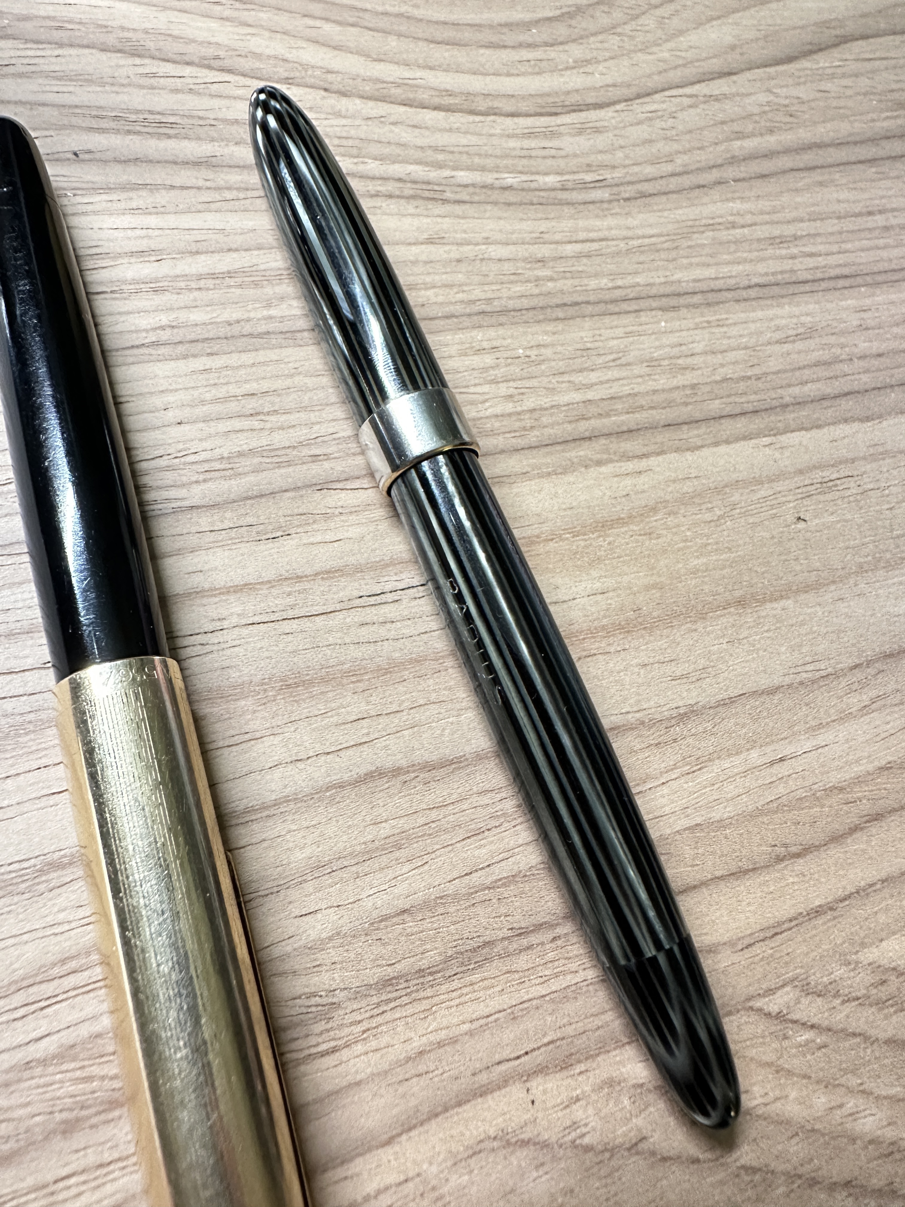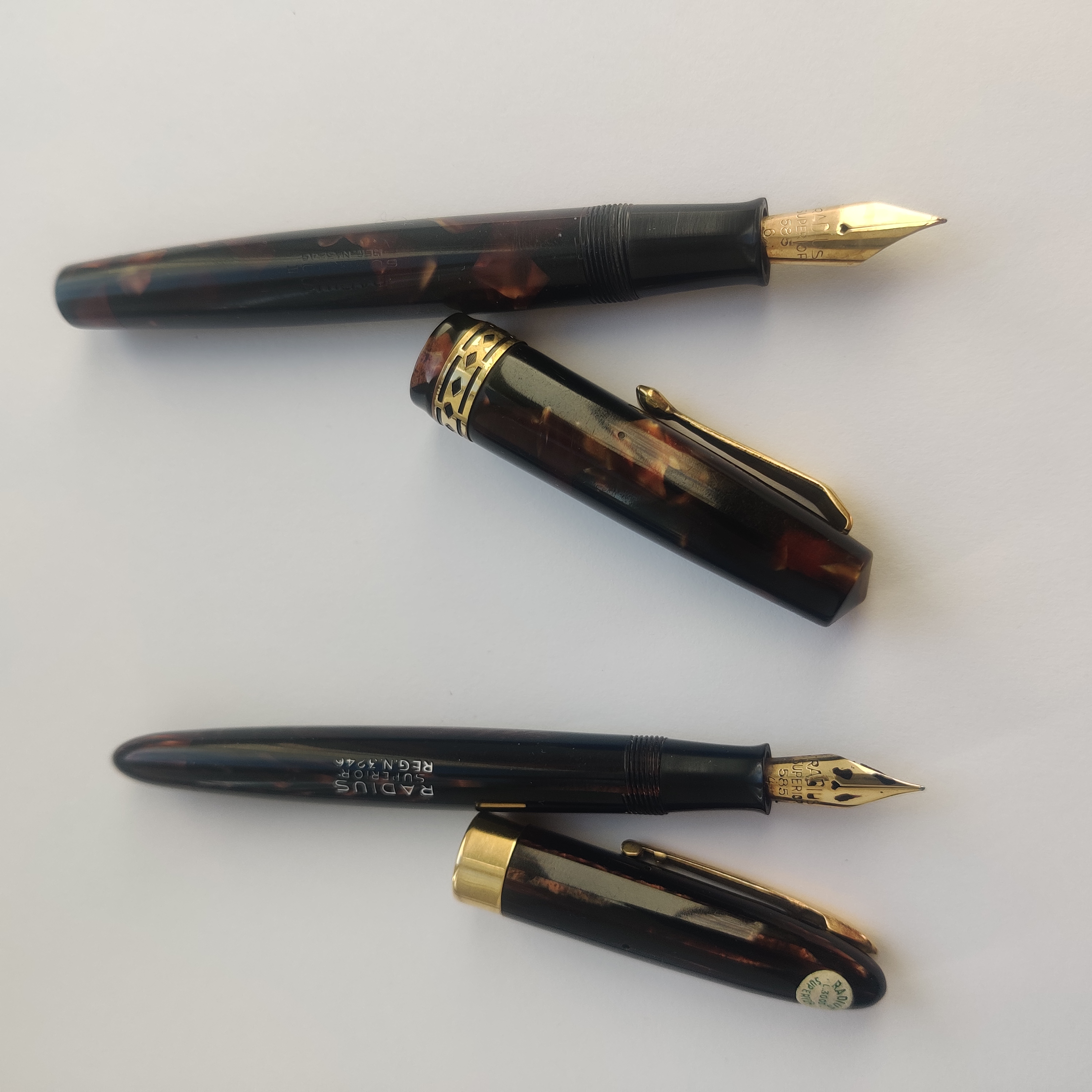 Due penne stilografiche "Waterman Ideal" e "Conway Stewart Universal", nessuna delle due funzionante in quanto le sacche di inchiostro si sono deteriorate, ma entrambe complete.
