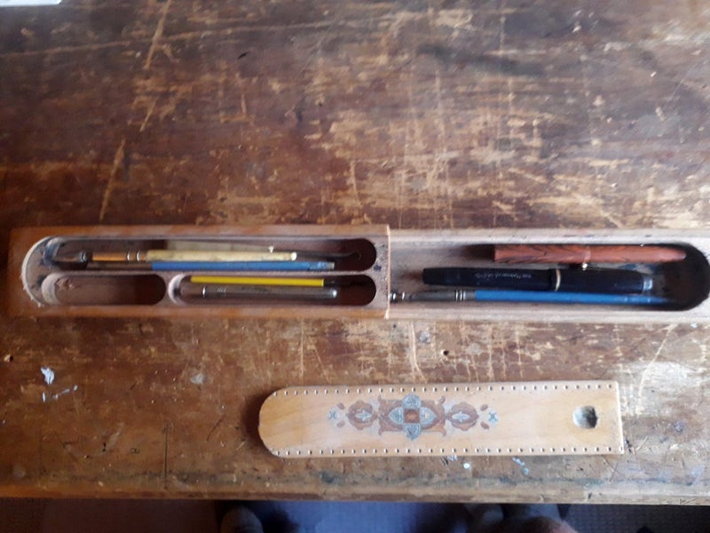 Un righello in pollici fuoriesce dal lato dell'astuccio.