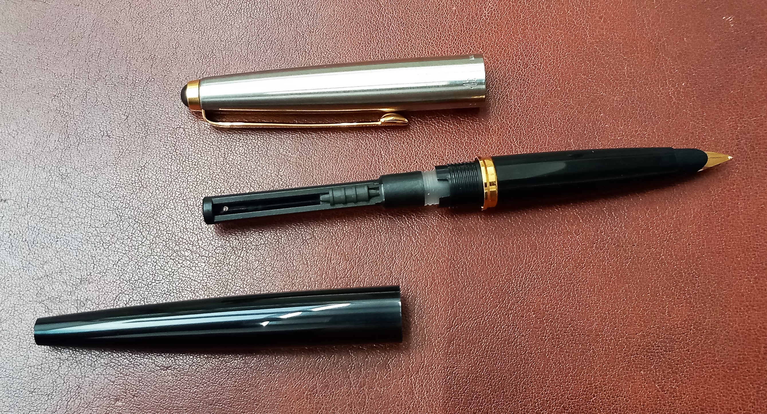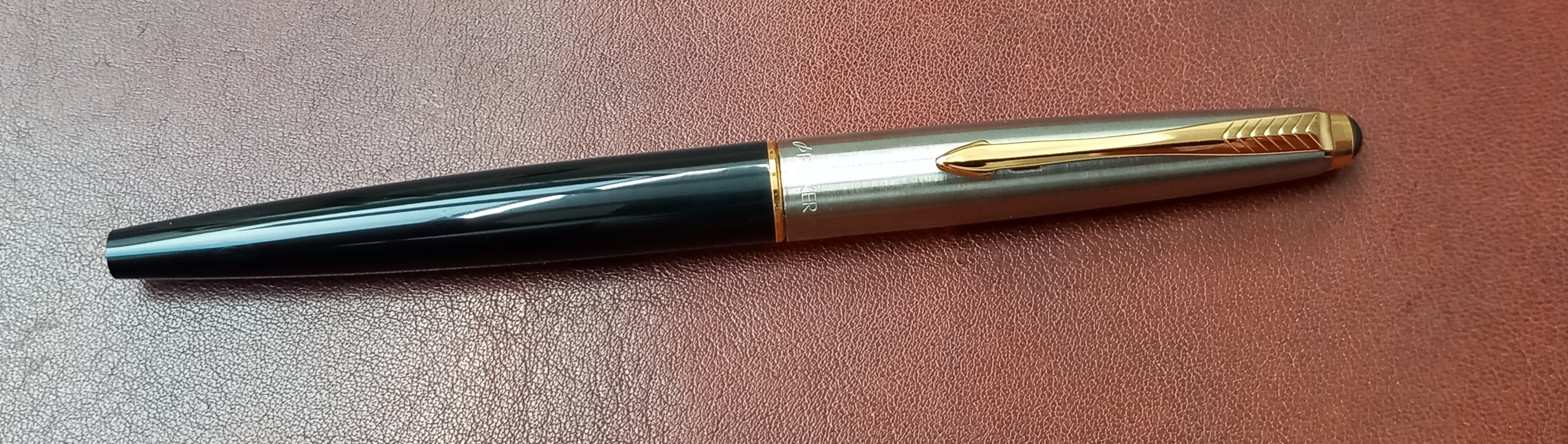 Parker 45 Classic GT ultima serie (2001 - 2007), prodotta nel primo trimestre del 2007 (porta la sigla P.III), converter a slitta, pennino in acciaio dorato di misura M. Caratteristici il gioiello in plastica incastonato sulla corona del cappuccio, l'asola d'aereazione sotto il fermaglio e la nuova foggia di quest'ultimo.