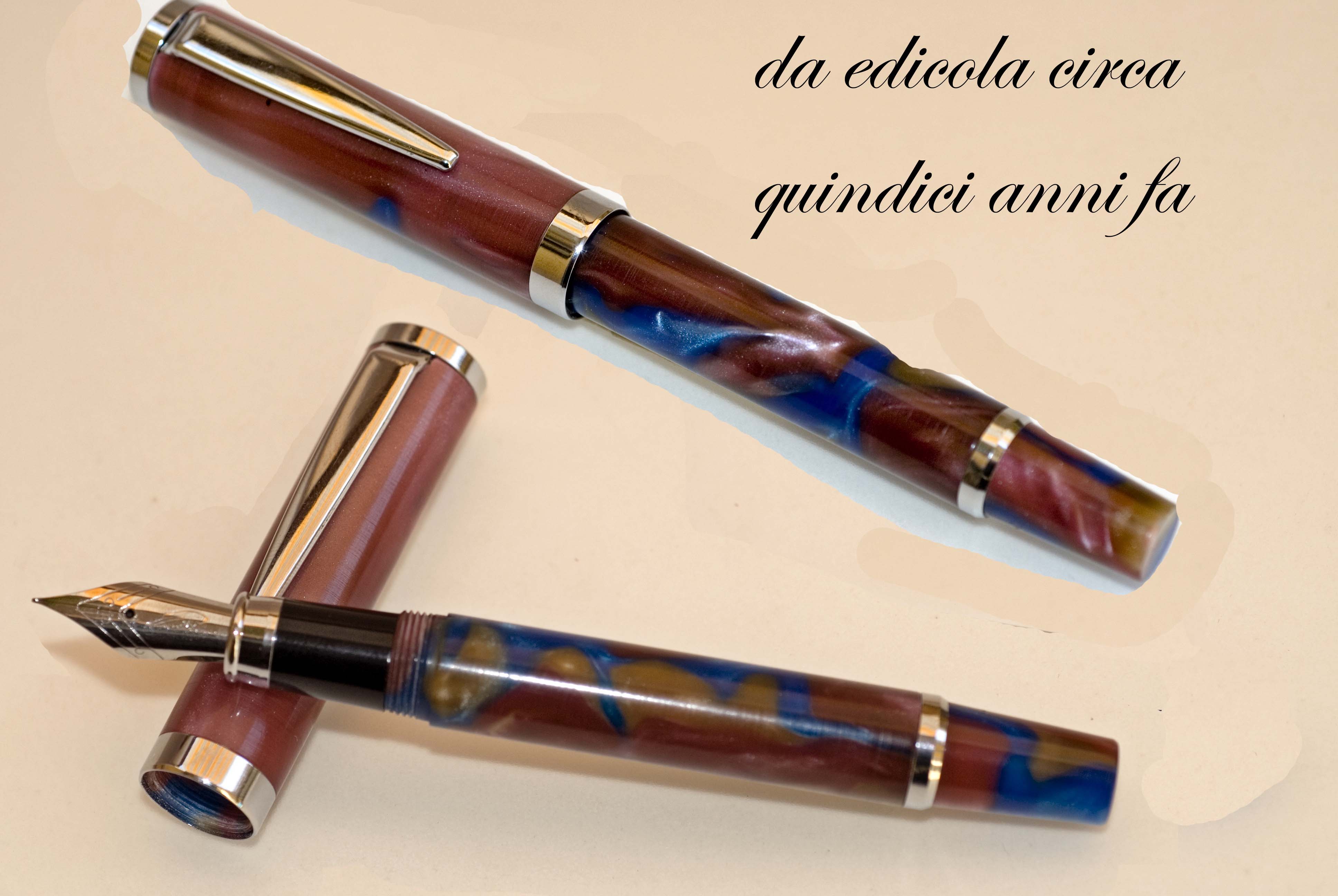 Sitratta di un Aurora 98 (ne ho due) con caricamento converter ; ancora Aurora 98 caricamento a pistone con pulsante che sparisce dopo la ricarica;una Zenith Extra; una Aurora Ipsilon cartucce/converter; una Lalex, marchio a me sconosciuto che ho preso sia per l'estetica che per il caricamento a pistone e anche qui il pulsante sparisce dopo la ricarica. poi c'è da ridere (lo so) perchè si tratta di penne comprate su una bancarella e, stando al venditore, comparse in edicola una quindicina di anni fa e dovrebbero essere la riproduzione (alla buona e con molta immaginazione) di penne blasonate. Non ho capito a quali originali s'ispirano. le ho comprate perché il blocco costava dieci euro e poi cosa strana, dopo il lavaggio, funzionano alla, perfezione, a cartucce ovviamente. Per finire all'insegna del trash che più trash non si può due anonime made in Twain, funzionanti senza esitazioni. per la qualità delle foto chiedo scusa ma al momento il set per la macrofotografia l'ho prestato e ho cercato di rimediare alla meglio.