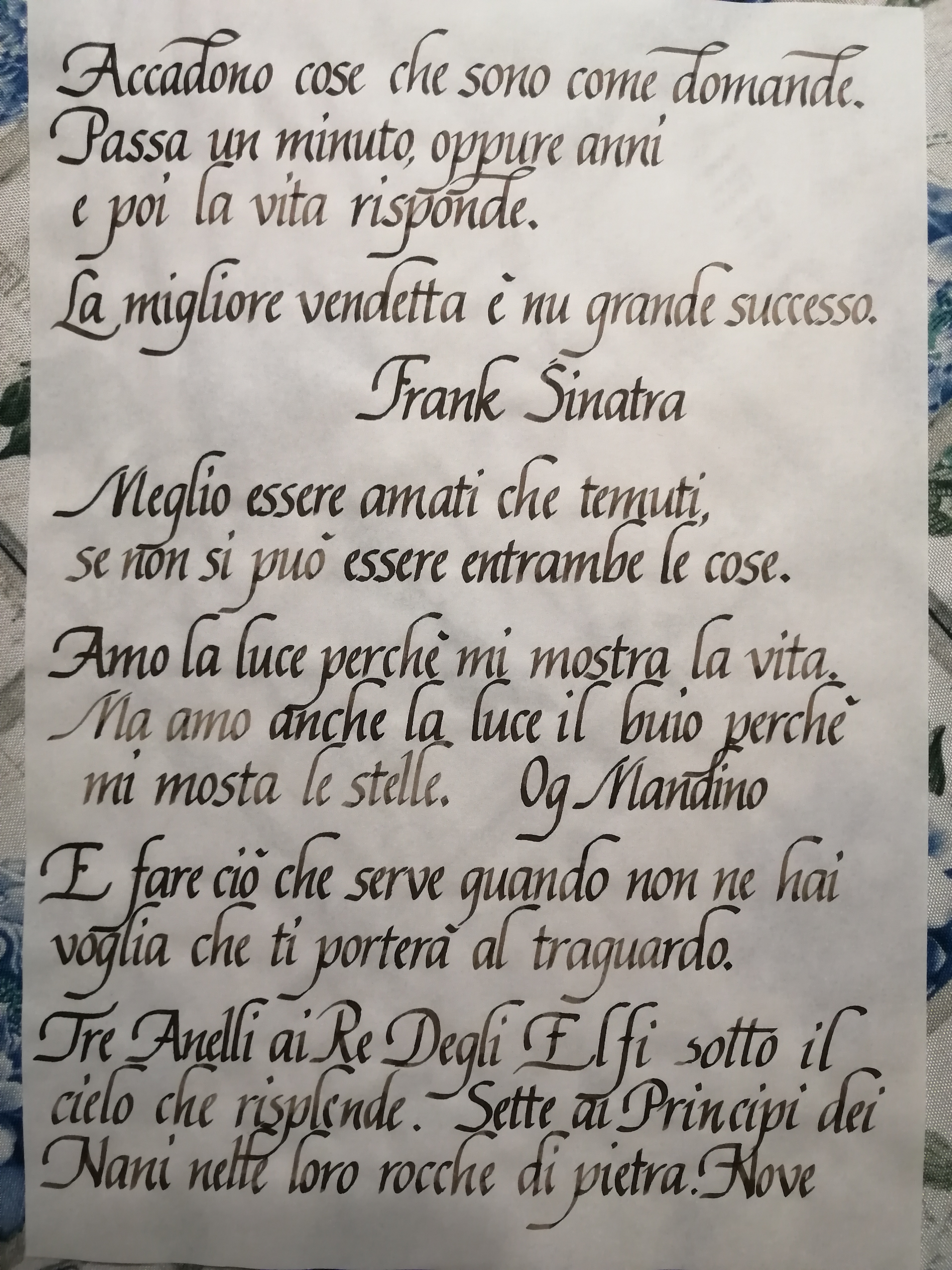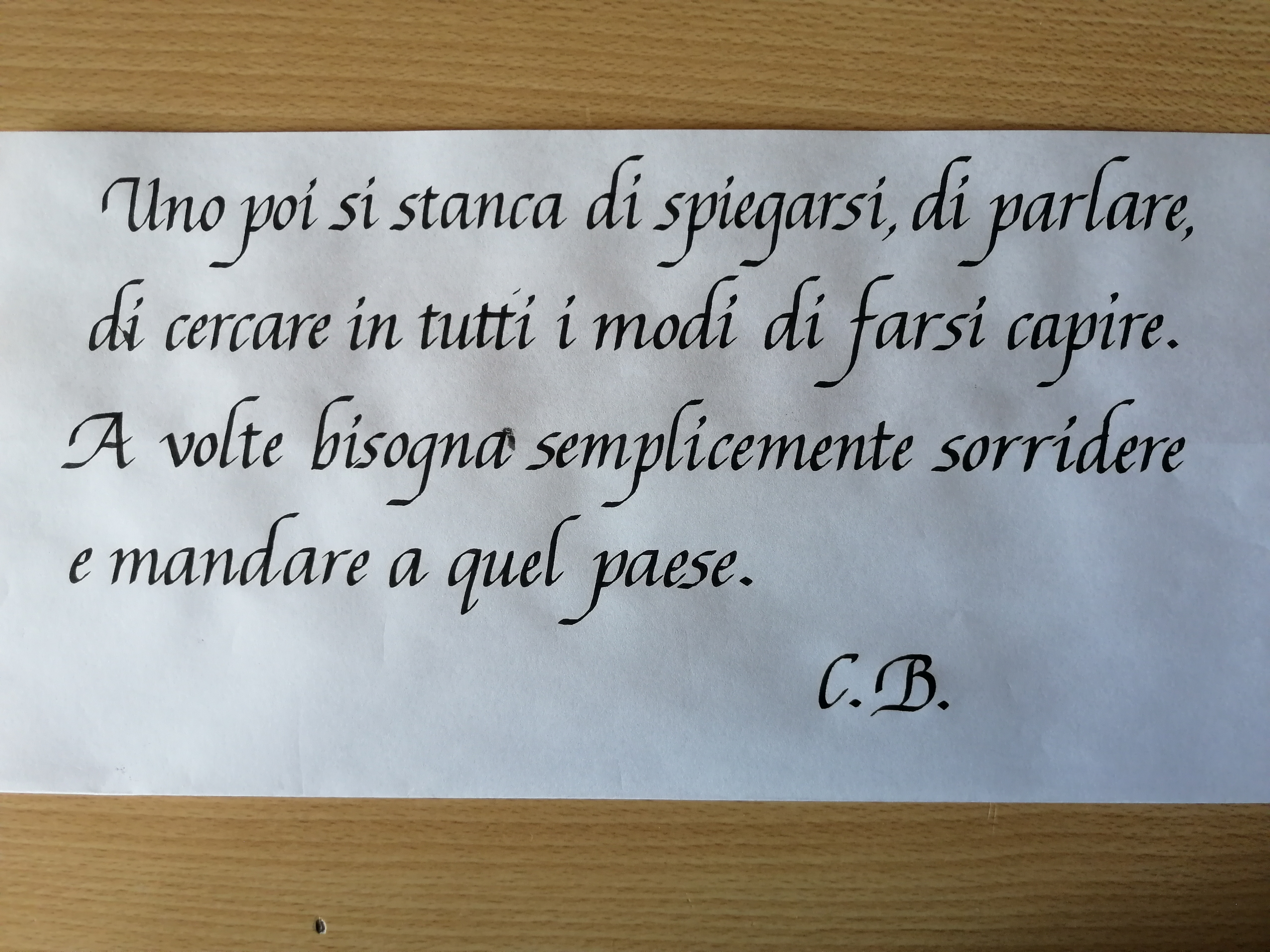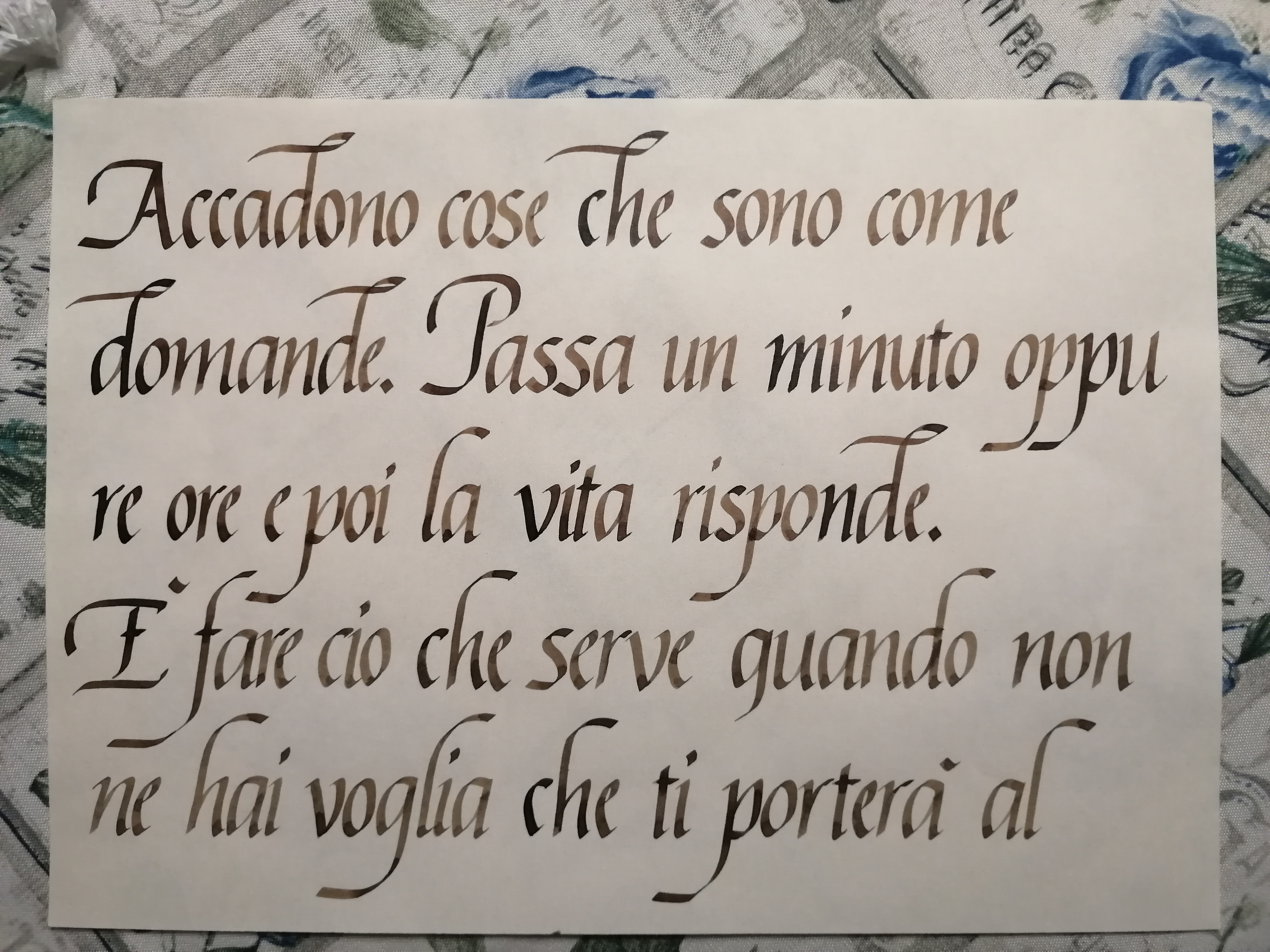 Ho provato a riprendere in mano questo stile, anche se ancora per conto mio. Spero di poter iniziare a seguire le lezioni programmate il prima possibile. Guardando delle vecchie correzioni ho cercato di migliorare gli spazi nonché l'odiata a. Ho anche provato qualche grazia e abbellimento,ma non mi esprimo