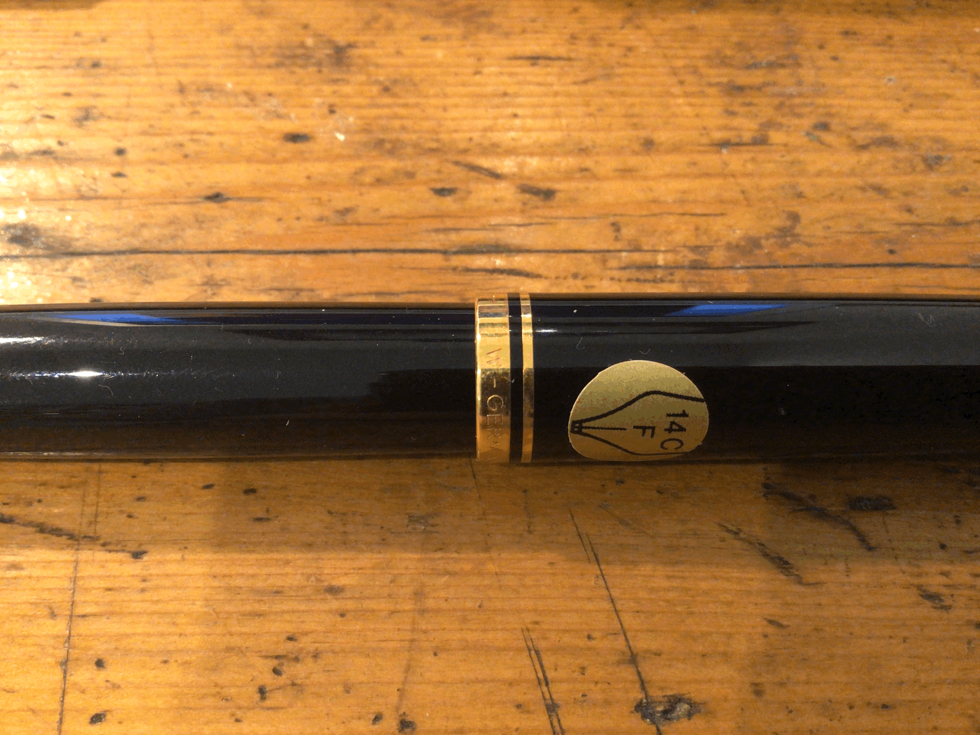 La penna in questione sembra essere stata prodotta nella Germania Ovest come si vede nella scritta sull'anello dorato del cappuccio. Il pennino è in oro 18k monotono anche se alcun zone sembrano più scure. La misura e il peso rientrano tra quelli dichiarati dalla Pelikan per le M600 old style. Rimane il grande dubbio del perché sul cappuccio ci sia scritto 14k F mentre in realtà è un 18k M. Sul libretto della garanzia non c'è scritto nulla riguardo al modello ma c'è una voce in cui si presentano i pennini disponibili per una eventuale sostituzione entro le 4 settimane dall'acquisto. Nessuno di questi pennini è in oro 18k ma sono tutti segnati come 14c-585.