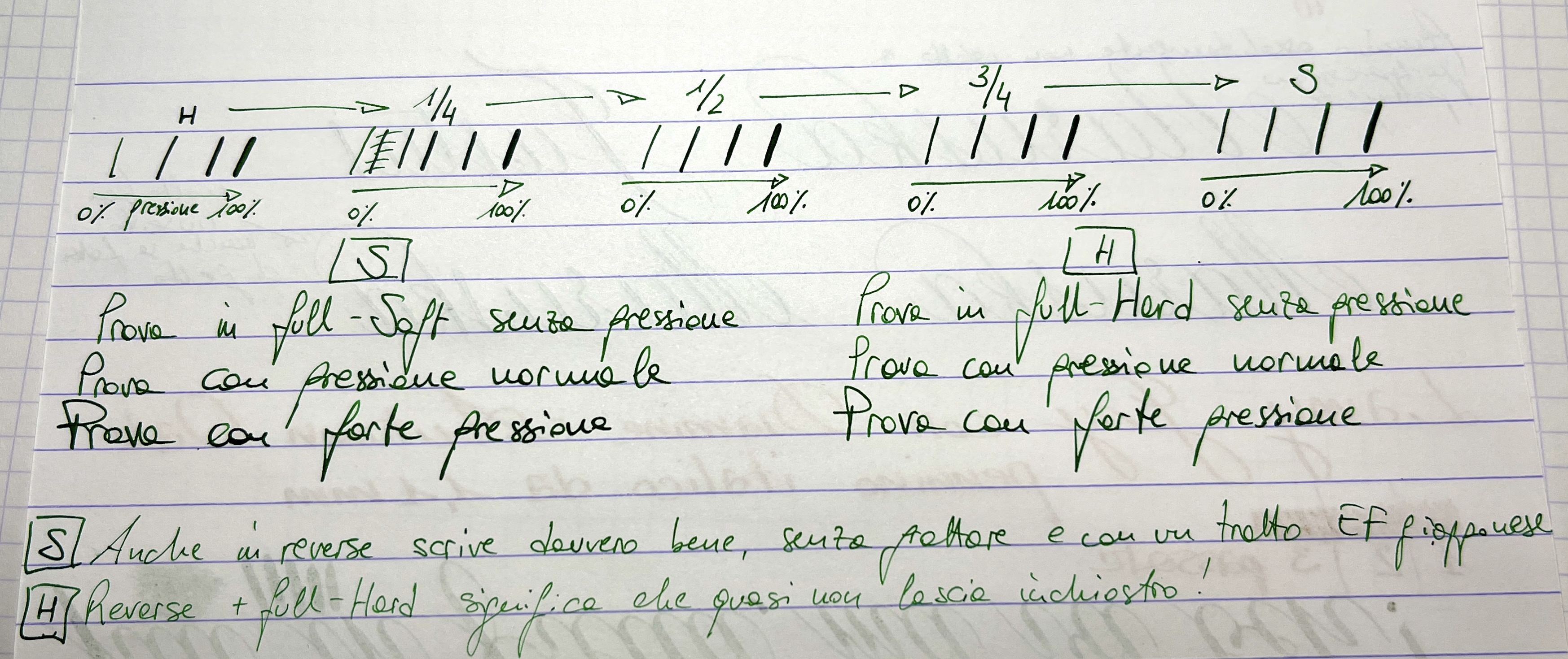 Geko, non voglio rovinarti la sorpresa, ma il pennino tende ad ammorbidirsi dopo un po' di uso. Continua a usarla e vedrai che migliorerà (ci vuole qualche ora di uso effettivo, quindi per me qualche settimana). Con l'ammorbidirsi del pennino, noterai maggiore differenza tra i vari gradi di regolazione e anche tra il tratto base HF e SF.geko ha scritto: ↑lunedì 4 luglio 2022, 13:29Purtroppo devo ricredermi.