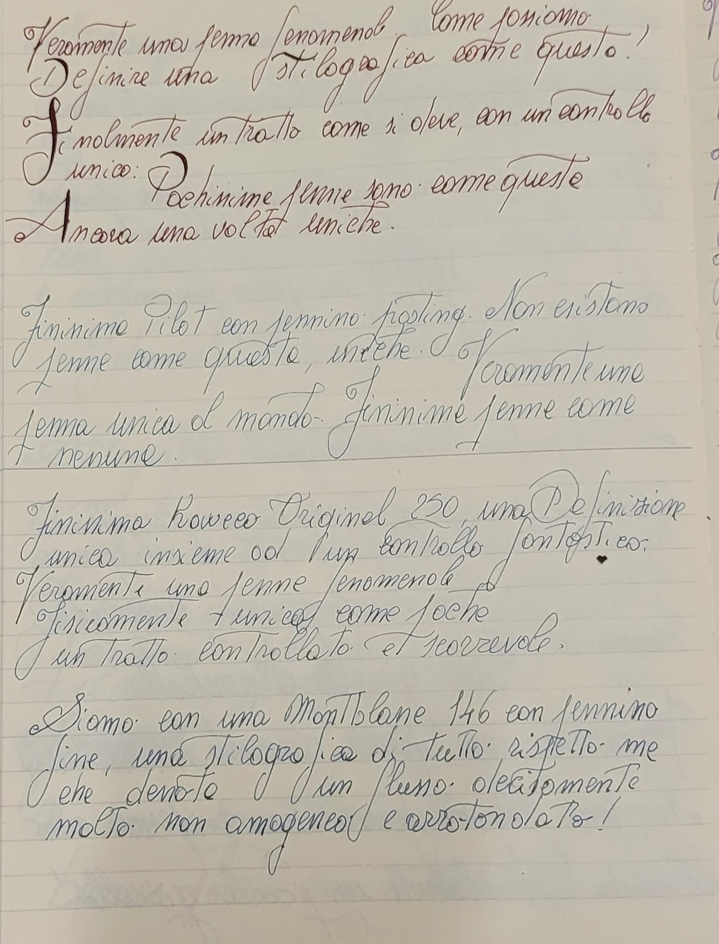 Si, sulla MB 146. Ha un flusso più copioso e la punta è molto arrotondata, quindi tende a produrre un tratto più rotondeggiate, meno definito e a volte come se sporcasse il tratto. Resta comunque una stilografica molto differente. La Pilot Justus invece mostra un aderenza inferiore sulla carta MD, stranamente perchè la carta è appena ruvida ma la superfice è molto trattata quindi sembra non aderire e mostra un tratto discontinuo e assolutamente bocciata. La uso con soddisfazione su altre carte, dove è perfetta. A differenza di entrambe la Kaweco è sempre perfetta, su tutte le carte. Provata anche su carte molto differenti come la Blasetti Schizzi e Strappa che ha una porosità differente. La Kaweco passa sopra sempre senza alcuna differenza.Koten90 ha scritto: ↑domenica 23 ottobre 2022, 8:00Da quello che scrivi, mi sembra di capire che la 146 abbia un flusso molto abbondante e un tratto più grosso e che la Justus sia più scivolosa e meno controllabile.linusmax ha scritto: ↑mercoledì 19 ottobre 2022, 17:05 La MB mostrava un tratto dimosogeneo (variazioni di sfumature), una calligrafia impastata (tipica di una penna burrosa), difatti io la uso quando compilo l'agenda o quando intendo scrivere moltissimo e senza stancarmi, non di certo per la qualità dello scritto perchè c'è di meglio. La Justus invece mostrava la stessa definizione di scrittura della Kaweco ma una differente precisione con spaziature irregolari e un flusso espressivo.