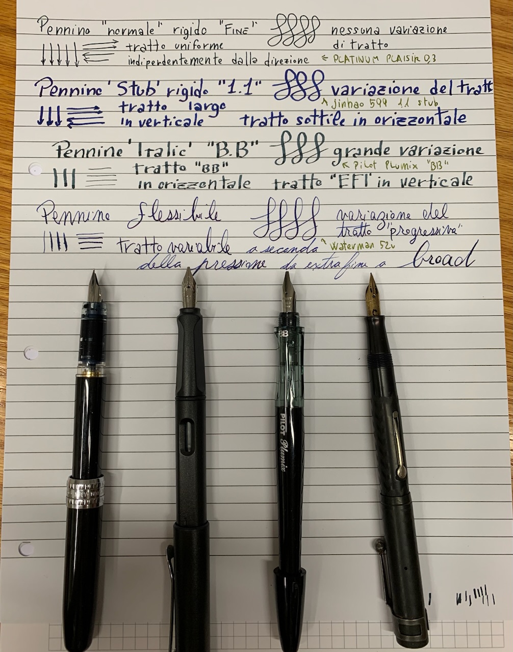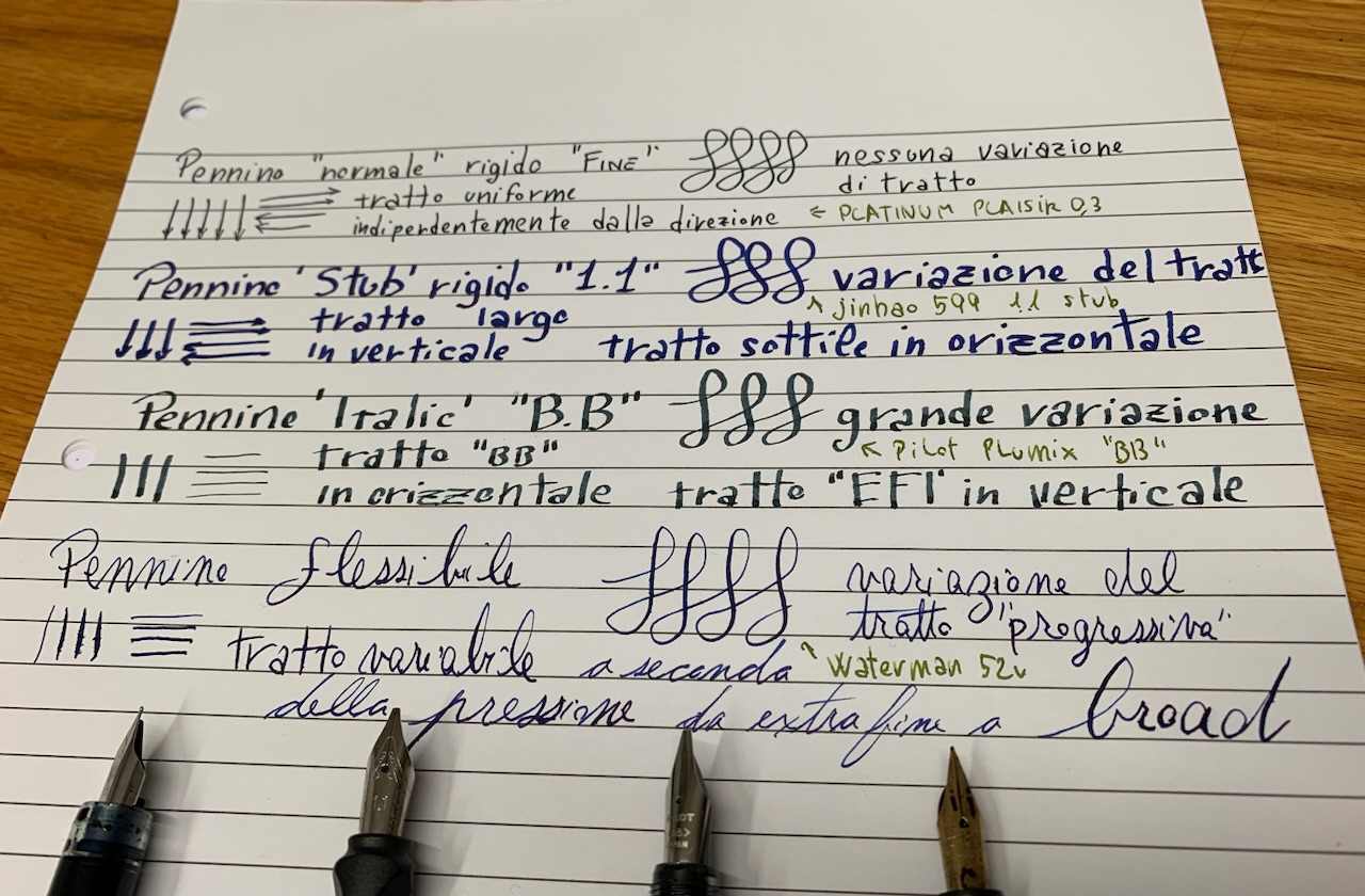 Lo "svantaggio" dell'italico è che è molto più affilato e appuntito dello stub, quindi ti obbliga a tenere il polso molto rigido bella posizione "corretta" senza sgarrare, pena grattare la carta, impuntarsi, o salti di tratto.