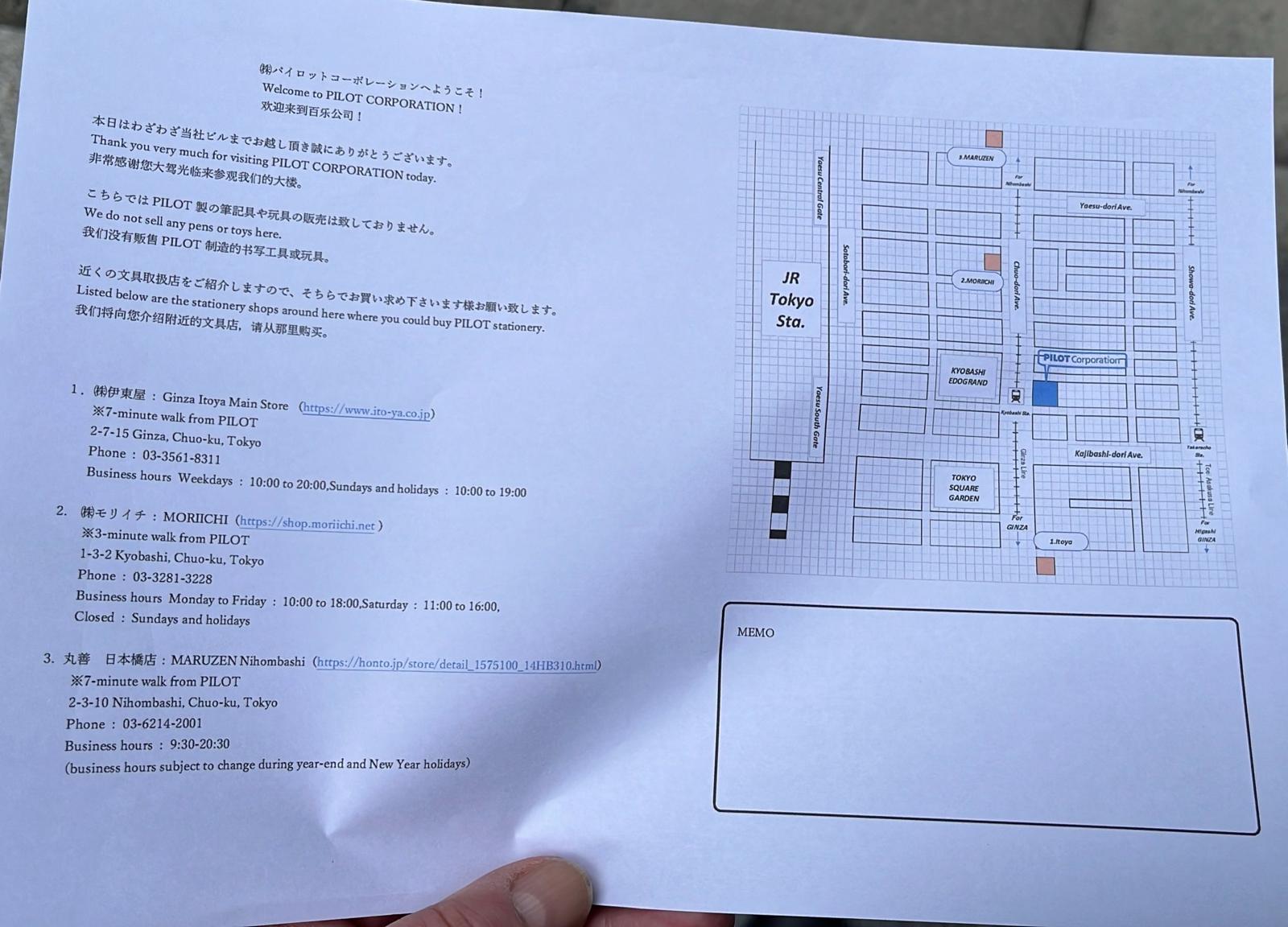 A Tokyo la cosa più semplice è seguire questa mappa che mi han dato all'headquarter di Pilot (non puoi salire, ma al piano terra c'è un piccolo museo)