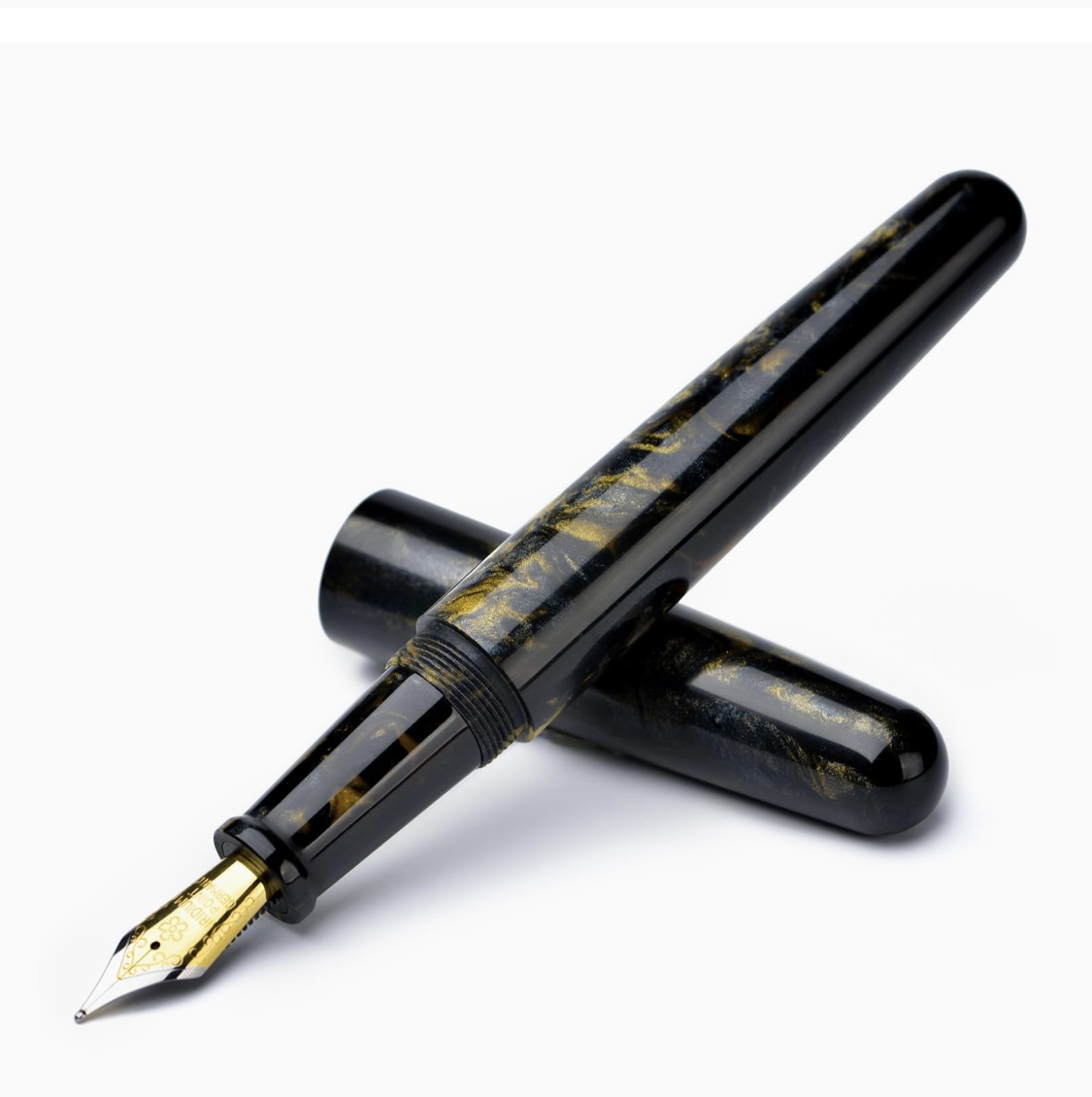 Finalmente ho inchiostrato la Fuliwen 017 in livrea nero-oro. A guardarla sembra la foto di una galassia. La resina è bella spessa, ma la penna scivola leggera sul foglio senza bisogno di calzarla. Il pennino M è un po' troppo bagnato, ed io prediligo gli M. Il pennino reca incisa la scritta: Iridium point Germany su tre righe.
