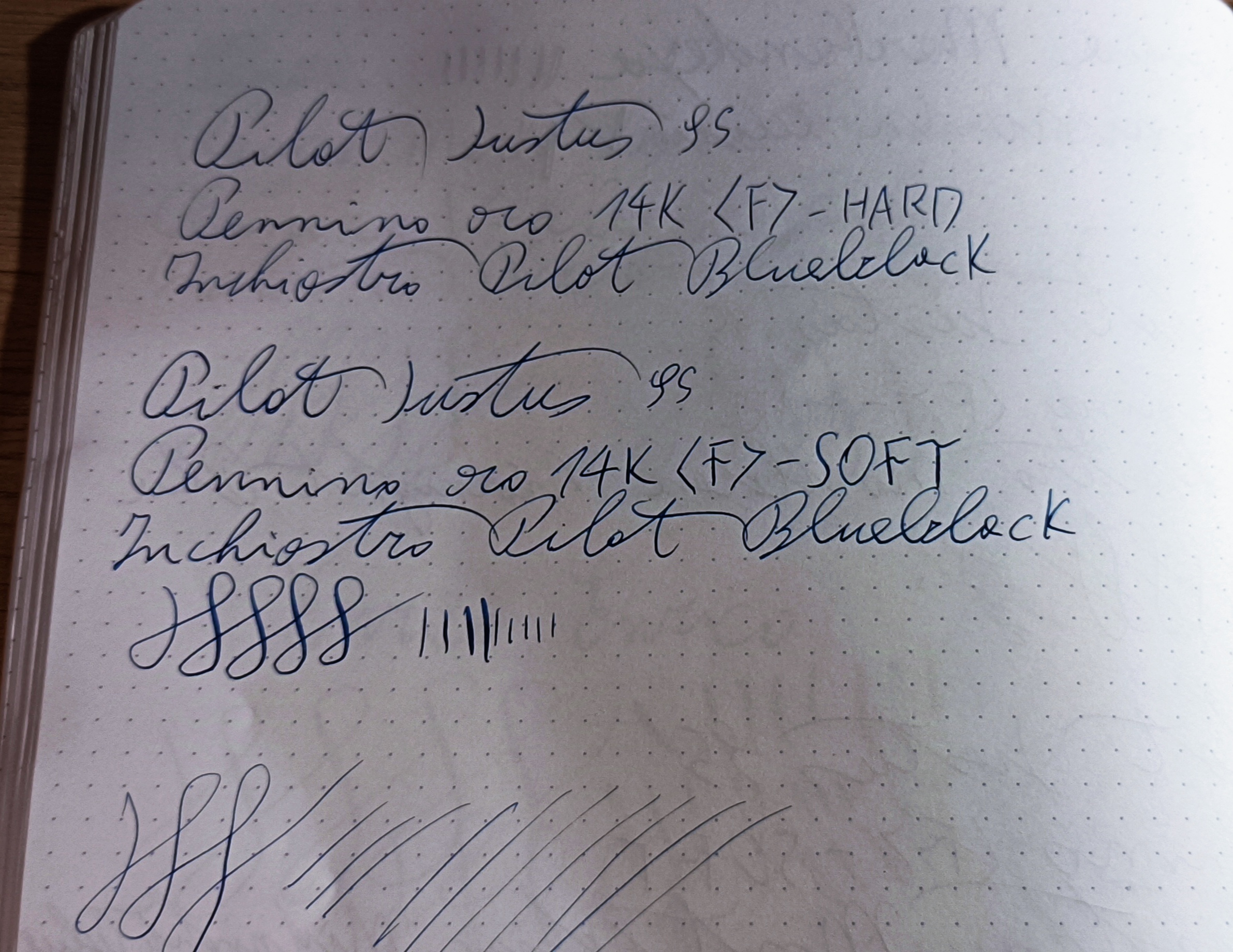 Per quanto riguarda la Justus, la mia è con pennino F; non ho mai avuto una 78G M, ho avuto una Lightive con pennino F, rispetto al pennino in acciaio Pilot questo è leggermente più fine. Poi dipende anche dove si posiziona la ghiera, se si mette su S il tratto a parità di pressione è leggermente più spesso perché c'è più flusso di inchiostro. Ecco una prova di scrittura :wave: