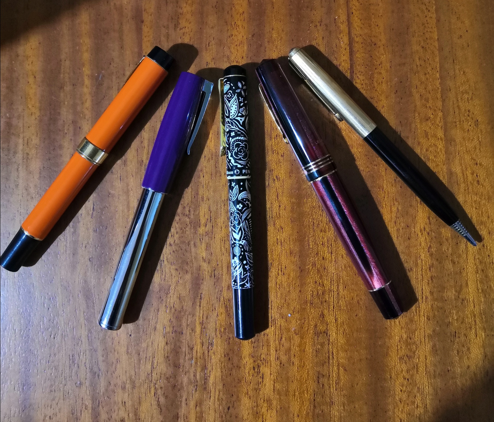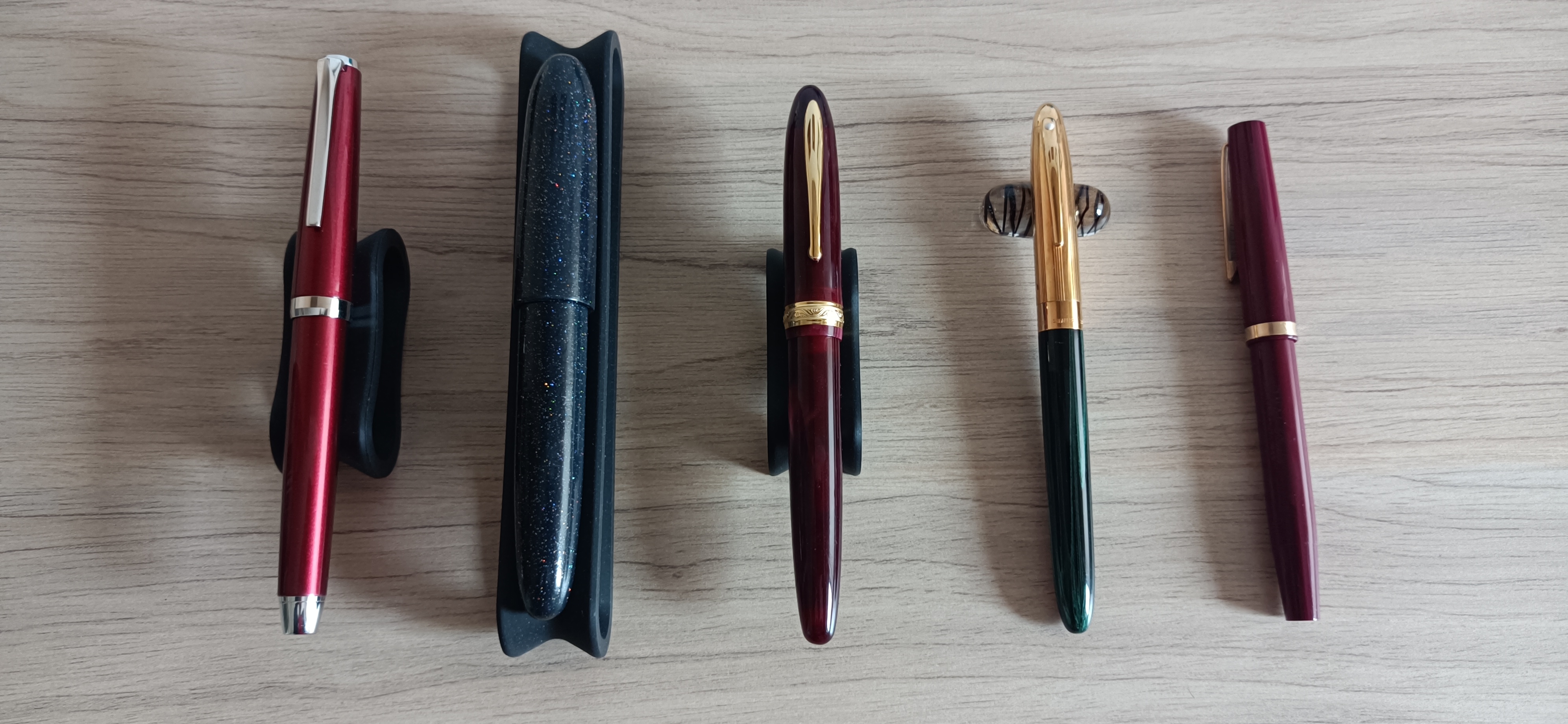 Pronte per domani, le due penne "istituzionali", Momento Zero e Pelikan Nonmiricordo, cariche con i due X-Feather rispettivamente blu e nero, Faber Castell Loom carica di Diamine Syrah e, e qui qualcuno inorridirà, Filcao Leader arancione carica di Diamine Chocolate Brown, abbinamento molto autunnale. Bonus, Parker 51 portamine