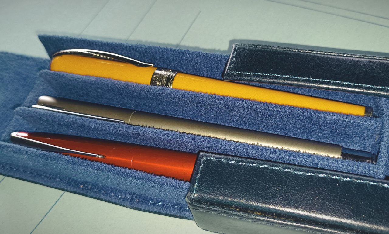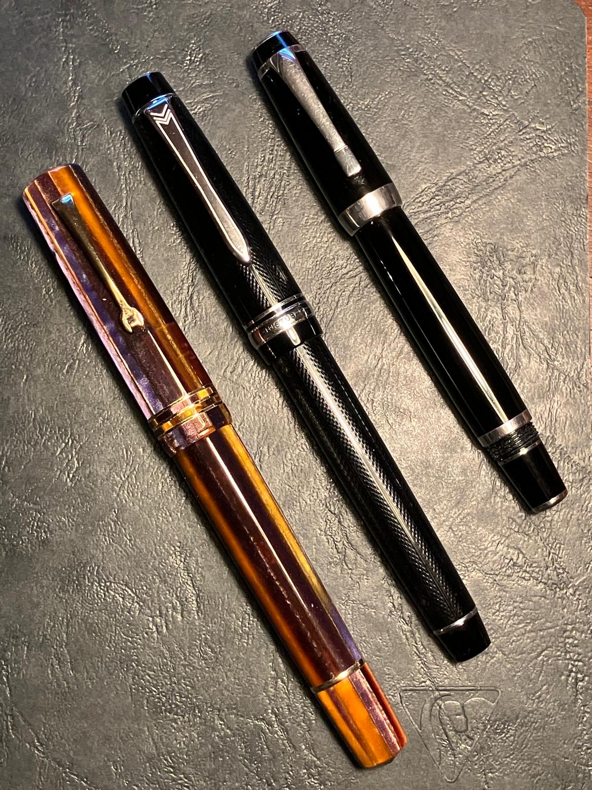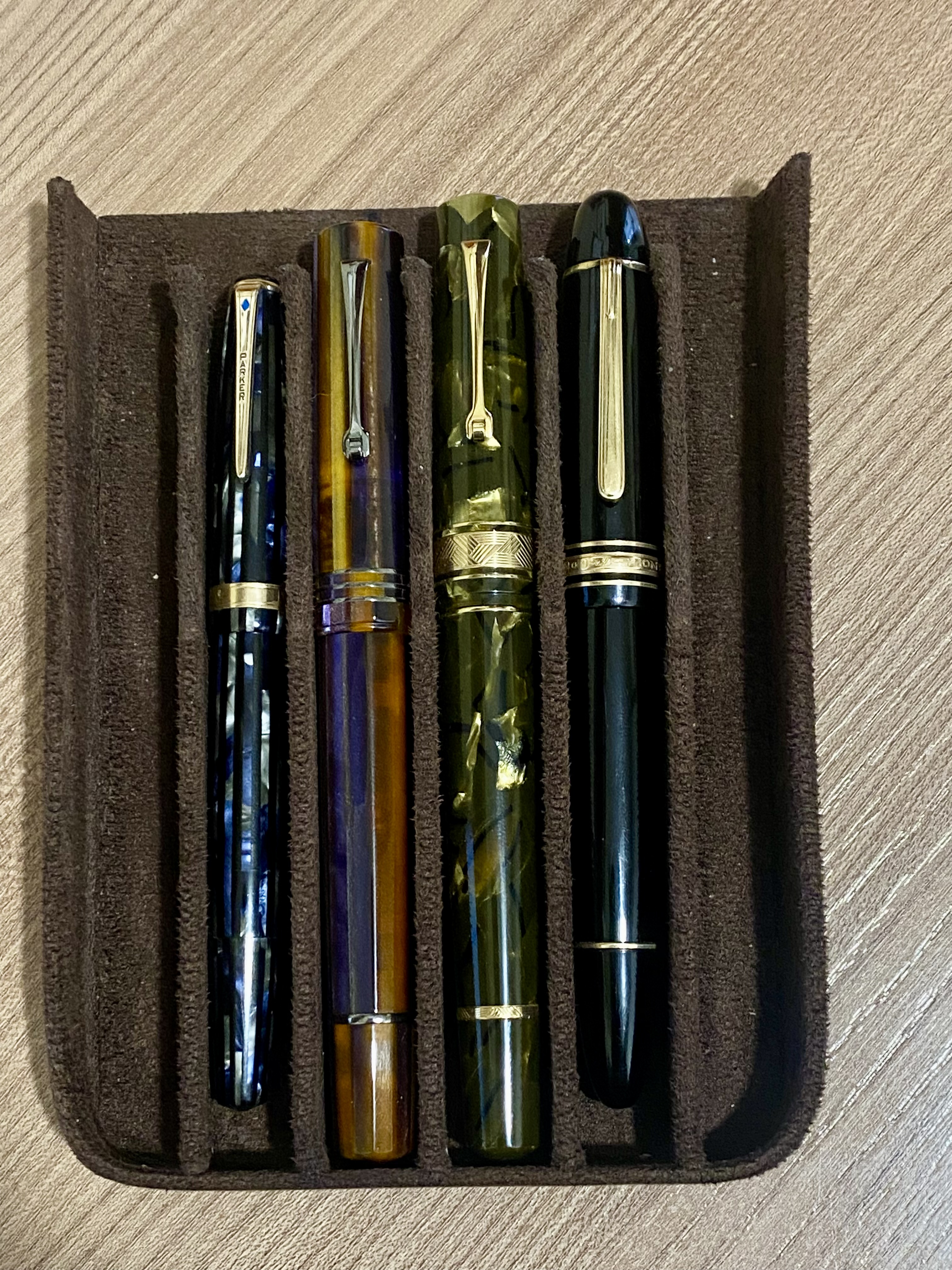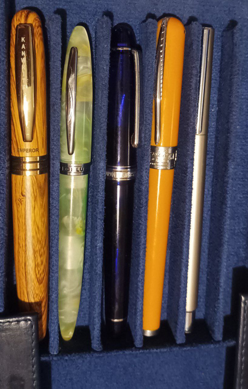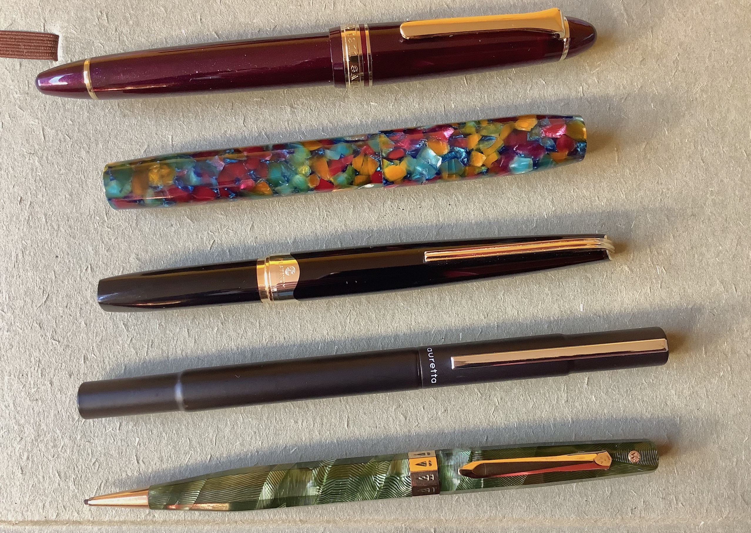 Sailor 1911S (medio-fine 14kt), Franklin Christoph 45FP (fine cursive italic di Yukio Nagahara), Platinum pocket pen (medio 18kt), Aurora Auretta metallo satinato nero, vecchia matita Doric Wahl Eversharp (che si crede una stilografica ed io la lascio fare...)