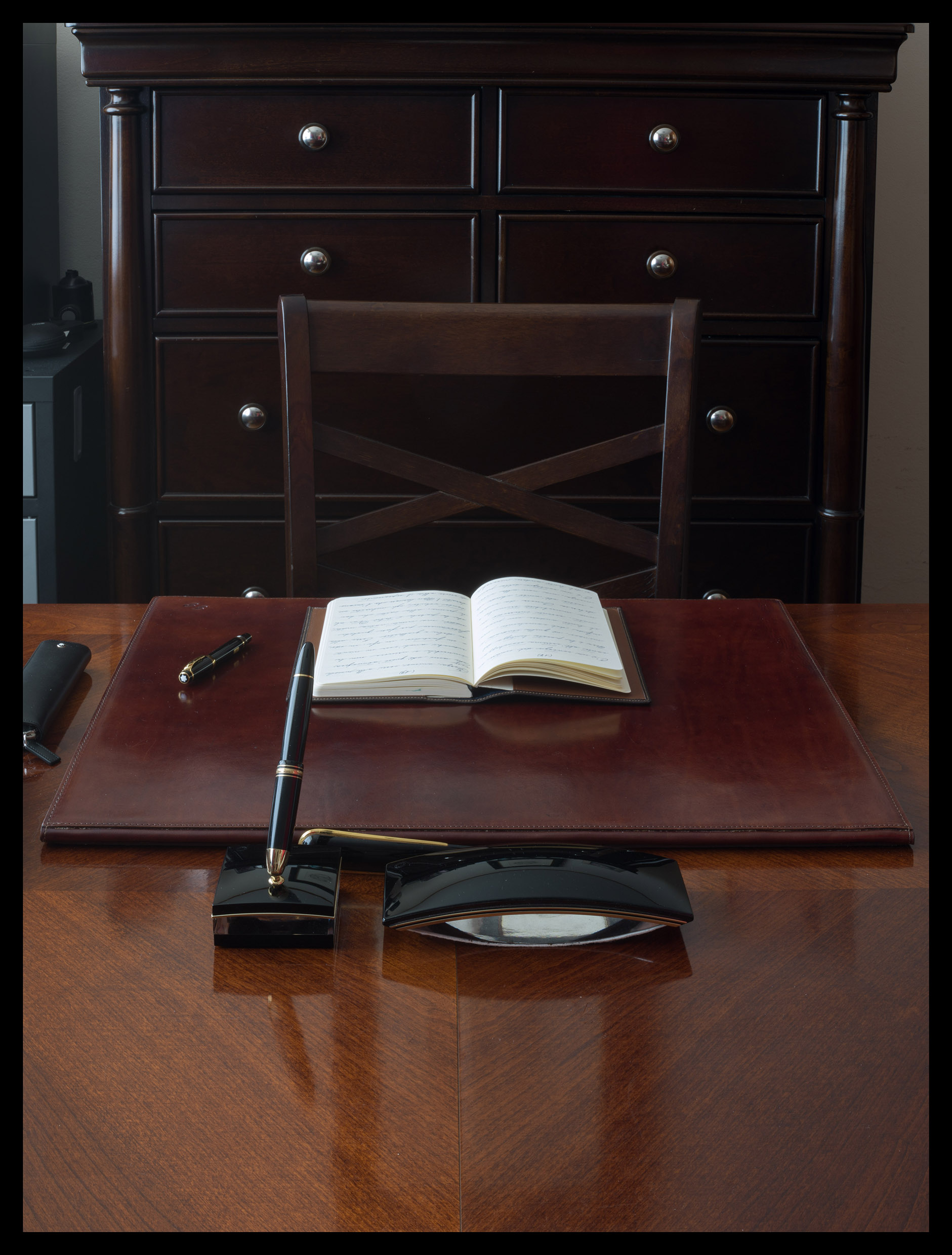 Oltre a varie carte che ho in uso al momento e che non so ancora dove andranno a finire, nel sottomano ho anche un foglio di cartoncino Bristol piegato in due. Mi serve per quando uso una penna dal pennino duro per scrivere su un solo foglio. La pelle del sottomano é "viva", e la punta dura la incide, lasciando una leggera marca. Preferisco per questo collocare il cartoncino Bristol e non marcare la pelle. Anche attraverso il cartoncino, la mano può ben sentire l'elasticità del cuoio sottostante, che rende la scrittura sui fogli sciolti molto più piacevole.
